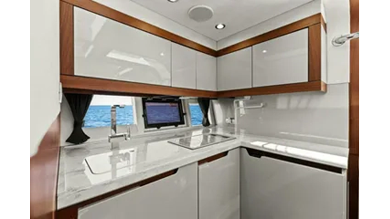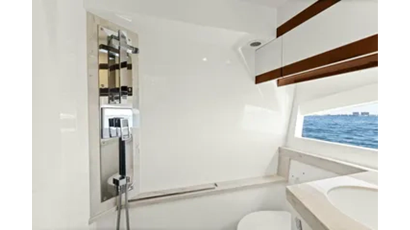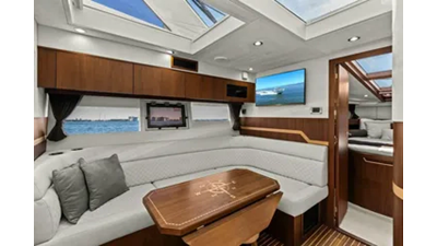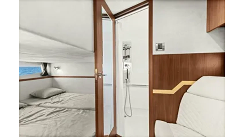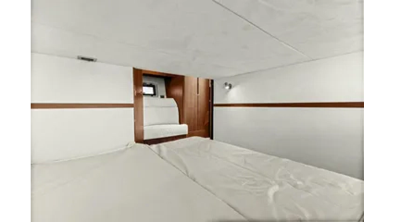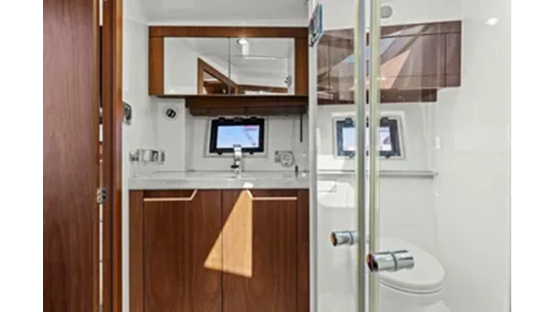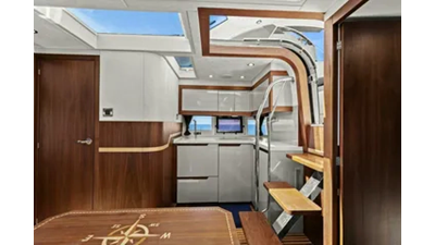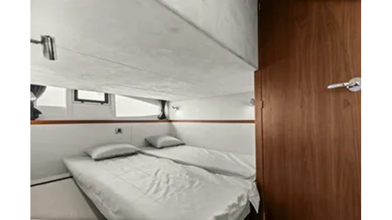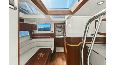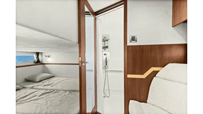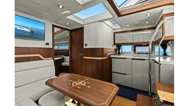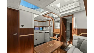 - 2 cabins, 2 heads with ample headroom and elegant woodwork, generous natural light from skylights and hull windows