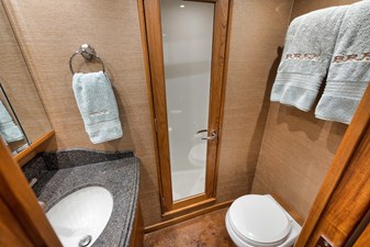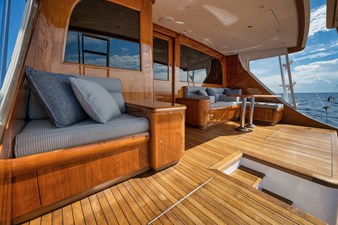 The owners’ exceptional attention to detail is evident throughout the vessel, which has been maintained to the highest standards. Inside, the Bree features a spacious layout with five staterooms and five heads. The master suite is thoughtfully designed, complete with dual sinks in the head. The salon showcases an islandstyle bar that promotes easy entertaining and cooking, and is fitted with top-of-the-line appliances and fixtures. An oversized pantry provides ample storage for dry goods, while six Sub-Zero refrigeration units keep cold items fresh. In the cockpit, you’ll find two large freezers and additional fridge/freezer combos. Signature Merritt woodwork enriches the interior, highlighted by a custom spiral staircase leading to the flybridge. Up top, the flybridge feels like the cockpit of a spaceship, featuring state-of-the-art electronics and two oversized seats alongside the captain’s chair for ultimate comfort while underway. A drop-down TV on the bridge adds to the entertainment options.