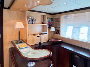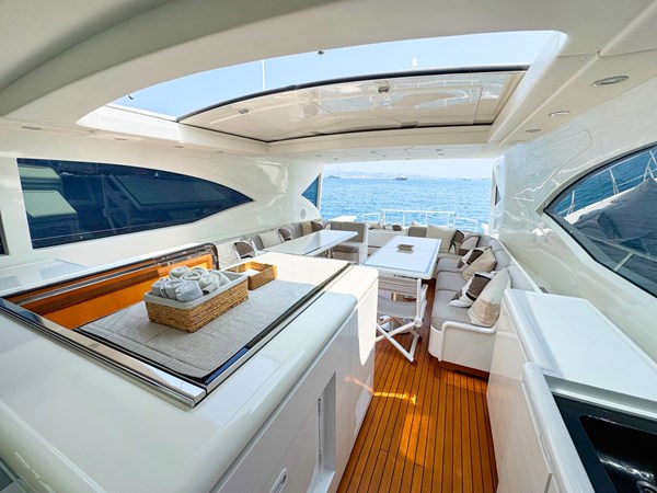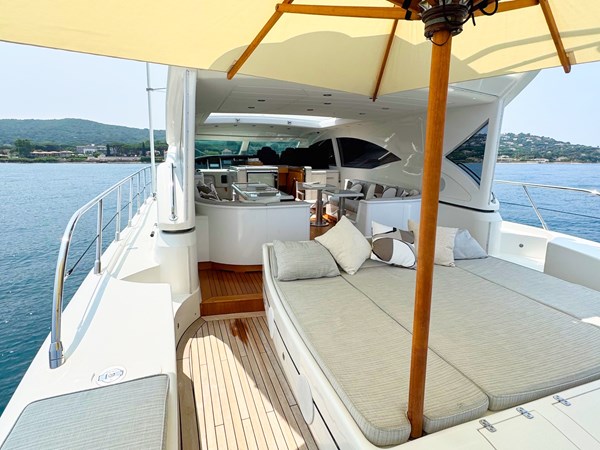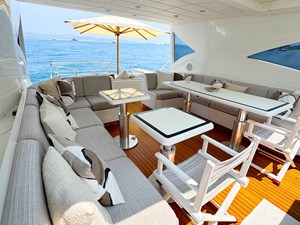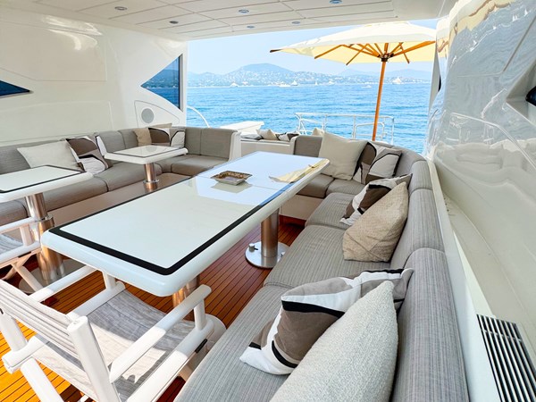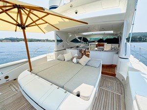 The exterior living areas are a true highlight, featuring a welcoming and elegant cockpit, designed for relaxation and conviviality. A spacious aft sunbed invites guests to unwind, while the forward sunpad offers additional lounging space and remarkable versatility.