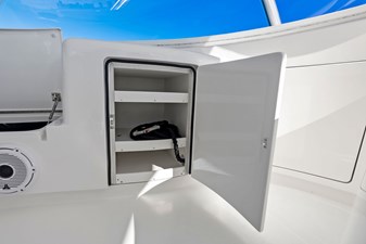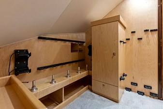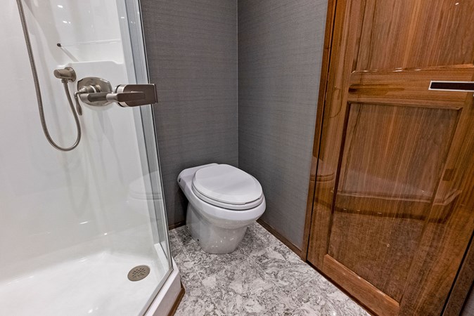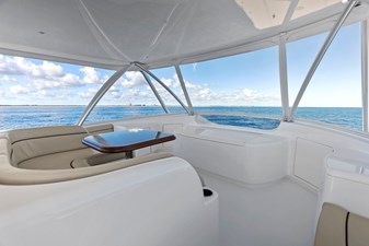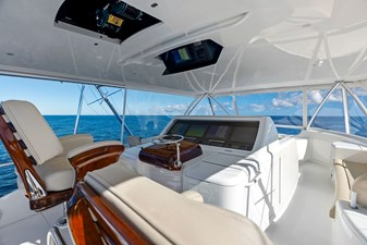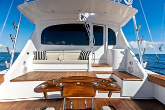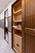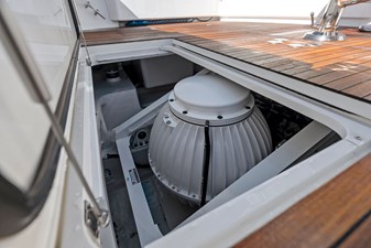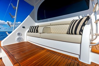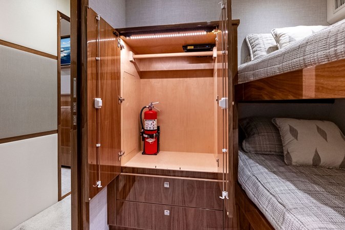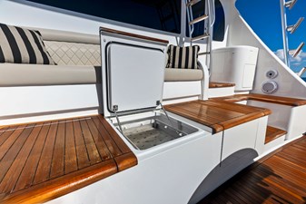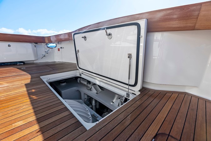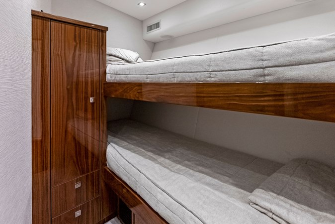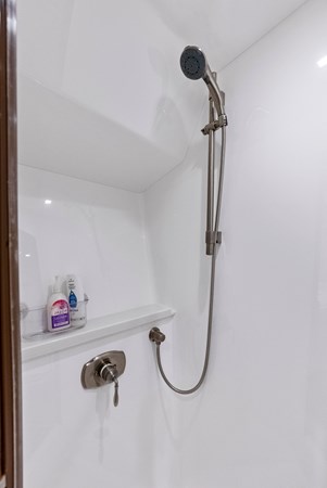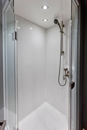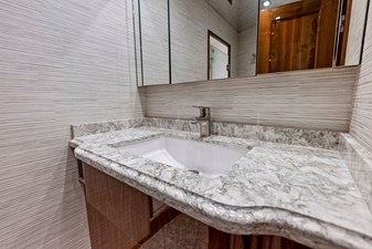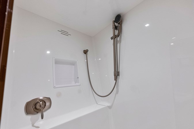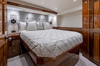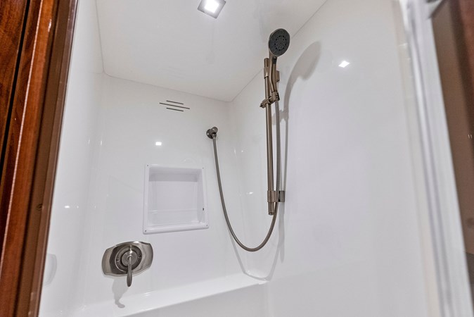 Accommodations are down below, of course, where the five-stateroom, five-head layout is highlighted by a generous full-beam amidships master that is awash with light thanks to two big windows to either side. Her en-suite head is customized to the max with gorgeous Cambria Berwyn flooring and countertop, mirrored ceiling, and one-piece custom frameless shower door.