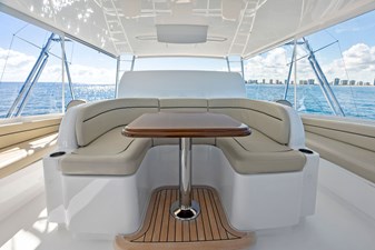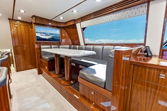 The huge galley features a Cambria Berwyn with Ogee Edge granite countertop with a three-stool serving bar forward and to port. A full-size U-shaped dinette to starboard sits atop extra rod stowage.