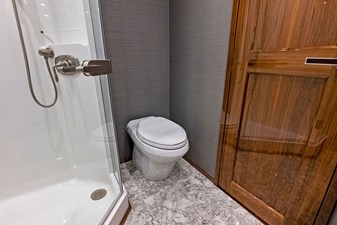 Entering through an electronic sliding salon door, the salon easily takes your breath away. A Pier Oak Amtico flooring entrance joins luxurious wall-to wall carpet, with lined padding for sound absorption. Upgraded crown molding along with the walnut, high gloss finish on salon accents lends the space a certain sense of gravitas.