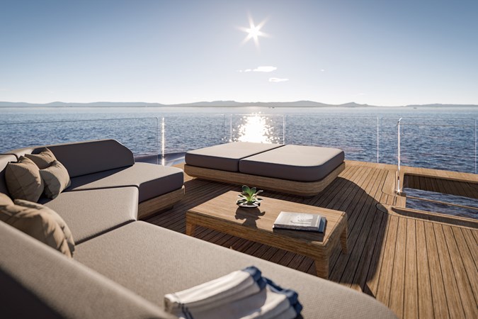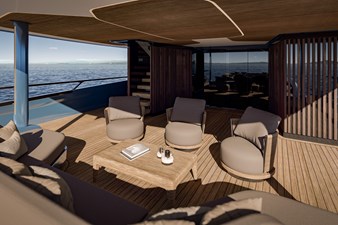A particularly well-considered feature is the private lounge beneath the wheelhouse, offering owners discretion and comfort while moored. The seamless flow between interior and exterior spaces, highlighted by continuous wood finishes, creates a refined yet relaxed atmosphere throughout.
