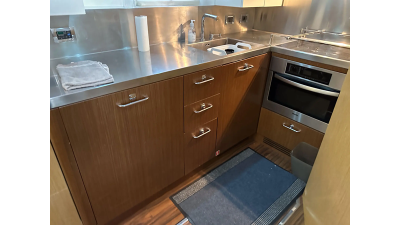 The aft lower deck includes a fully equipped main galley, accessible via a separate staircase for discreet service. A laundry area with a washing machine and dryer is also available. A fourth cabin, featuring bunk beds and a desk, can be used as an additional guest cabin or crew quarters, offering great flexibility for extended cruises.