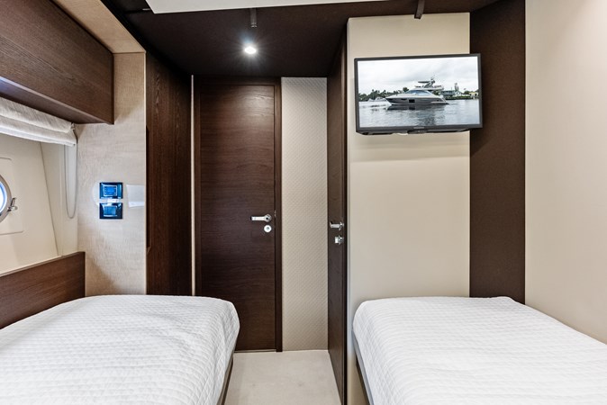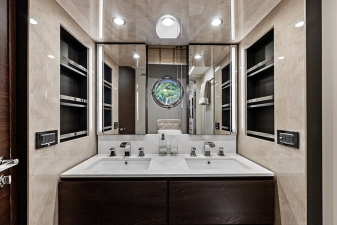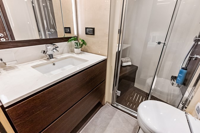 Below deck, Class Dismissed offers four well-appointed staterooms, including a fullbeam master suite, a VIP cabin forward, and two guest cabins, all with en-suite bathrooms. The master suite, positioned amidships, features large hull windows, a kingsize bed, ample storage, and a private lounge area, ensuring an indulgent retreat for owners. The yacht also includes separate crew quarters to enhance privacy and provide professional service.