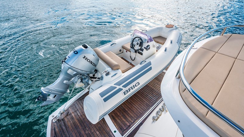 Her stylish exterior features sweeping tinted glass and polished stainless steel, while the hydraulic swim platform provides easy access to her 3.5m Brig Eagle tender. Inside, an open-plan saloon with premium walnut and smoked eucalyptus, Starlink internet, and BOSE/Fusion entertainment ensures comfort and connectivity.