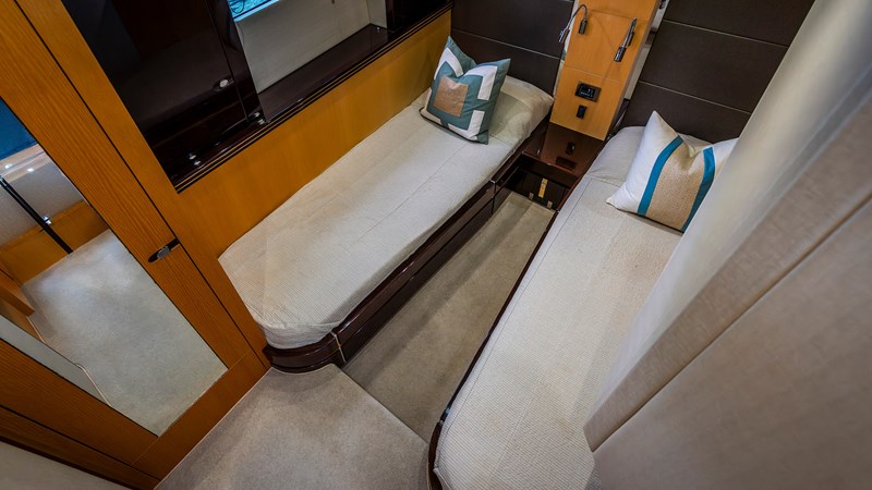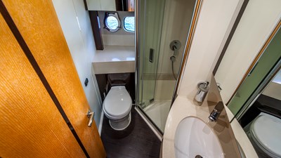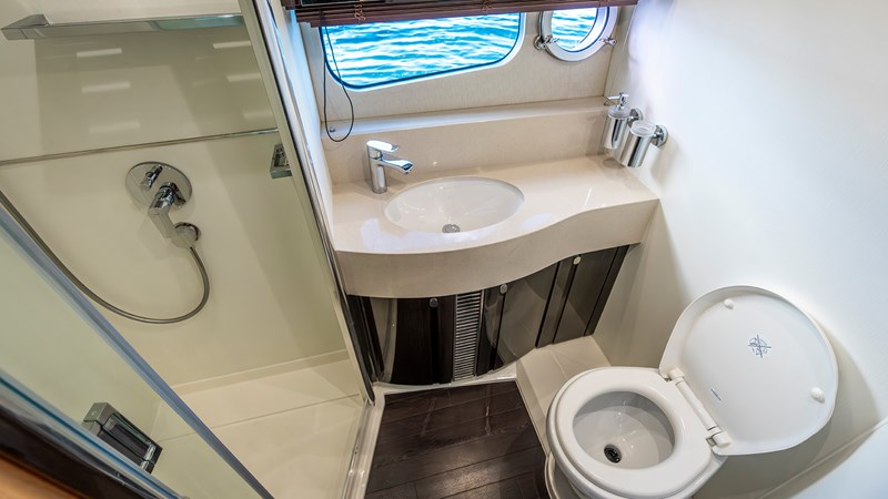 This 62’5” Sunseeker Manhattan combines luxury and performance in a sleek flybridge package. Powered by twin 715hp Caterpillar C12 engines, she cruises at 24 knots (max 30) with a 250nm range, offering smooth, efficient passages thanks to her refined planing hull.