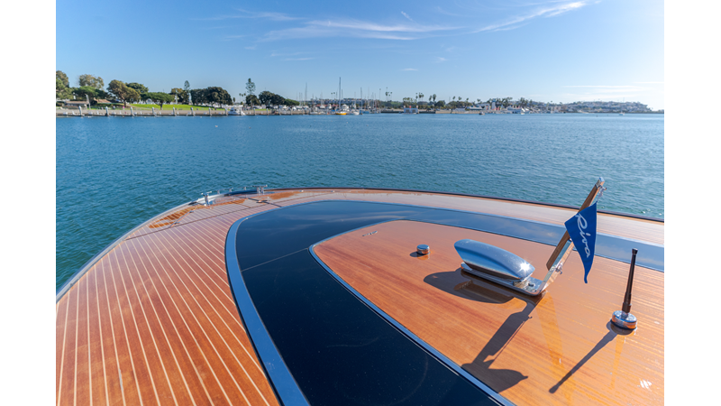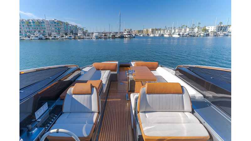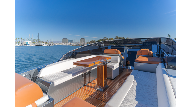 - Fold-down transom lounge and automatic bimini top