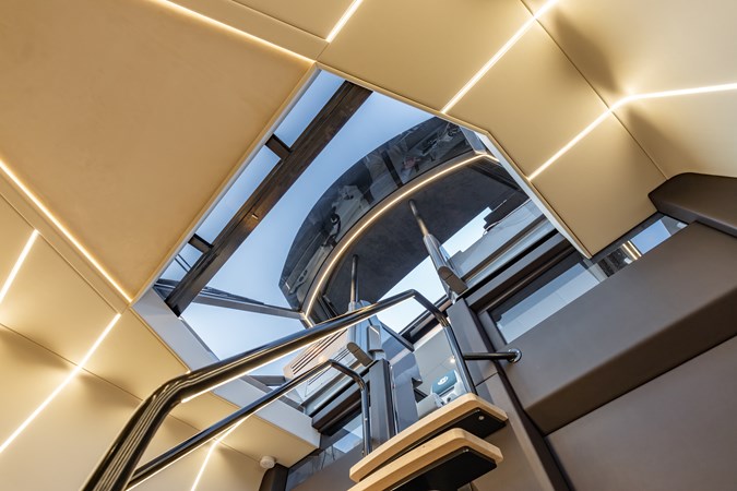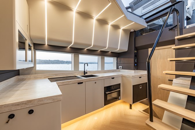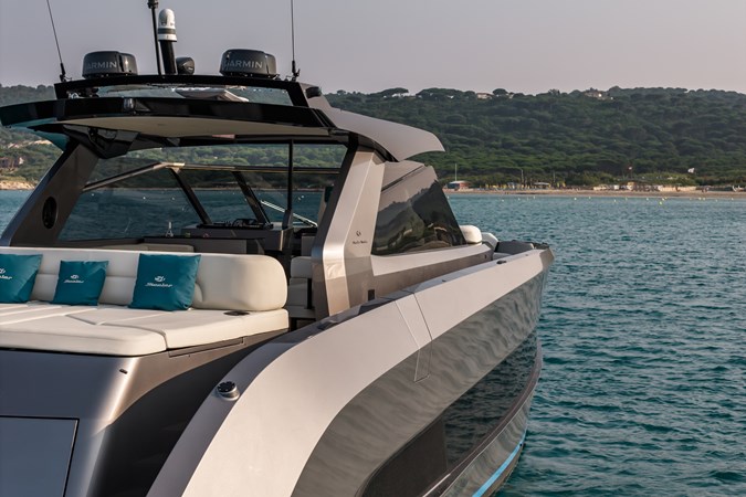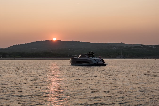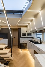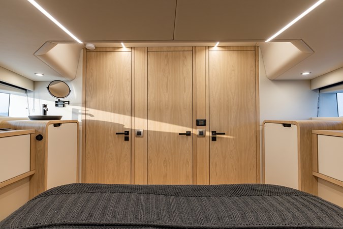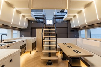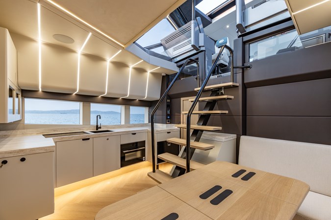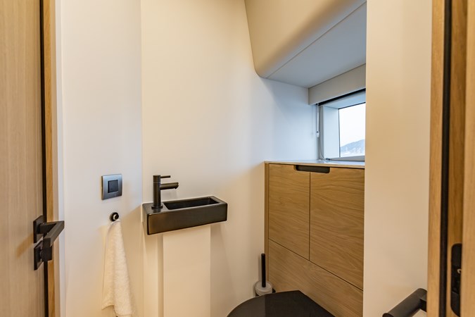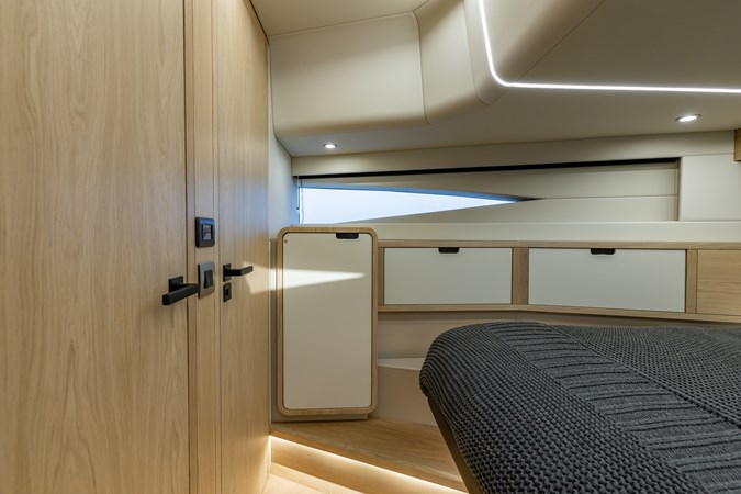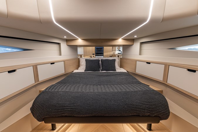 Voluminous Interior: Despite its sporty silhouette, the cabin offers a surprising 2.4 meters (8 ft) of headroom, accommodating 8 guests for day trips and providing overnight luxury in two spacious cabins.