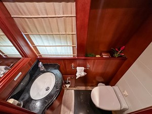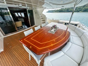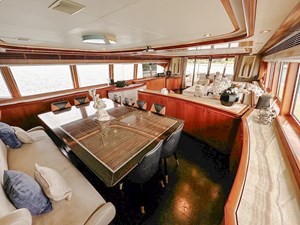 The yacht's communal areas are exceptionally spacious, offering an array of elegant social spaces. The main saloon, bathed in natural light, is a warm and inviting haven featuring an advanced entertainment system and plush U-shaped seating, perfect for relaxation or hosting guests. Forward of the saloon, the formal dining area seats eight comfortably, providing an exquisite setting for meals, all while enjoying panoramic views through the yacht’s large windows.