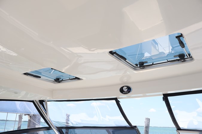 The Aquila 36 is a power catamaran that blends plentiful live aboard space and qualities perfect for socializing with rugged strength and control. Offering the conveniences of a large yacht including topside summer kitchen with smokeless grill, the Aquila 36 has cockpit seating for over two dozen adults and two comfortable cabins with private en-suite heads. A hardtop is available without an opening sunroof. Powered by efficient and reliable twin 350 horsepower Mercury Verado outboards, the Aquila 36 provides spirited performance and excellent fuel economy. Add its open water capabilities, wide stance and twin sponsons, and the boat is remarkably stable making it exceptionally comfortable at speed or while at rest.
