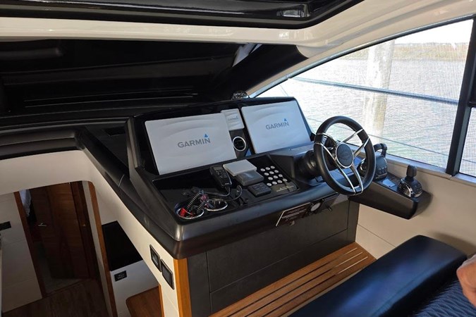 - Main Deck Salon: The main deck features a spacious salon with large windows for panoramic views and natural light. A key feature is the fully opening hardtop roof and fully opening cockpit window, which integrates the interior with the outdoors.