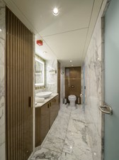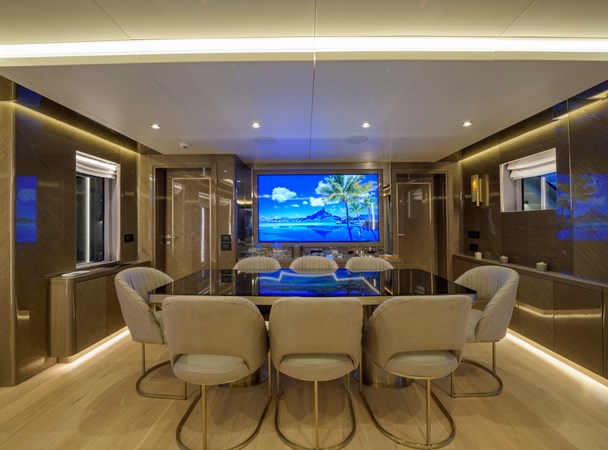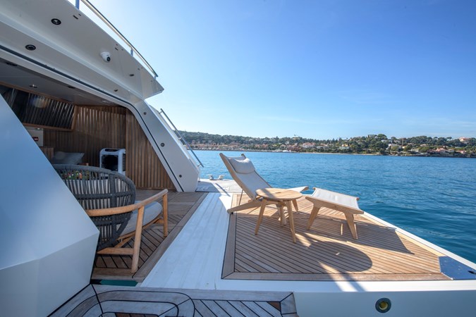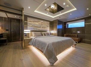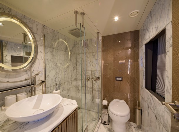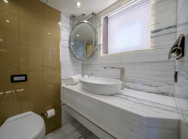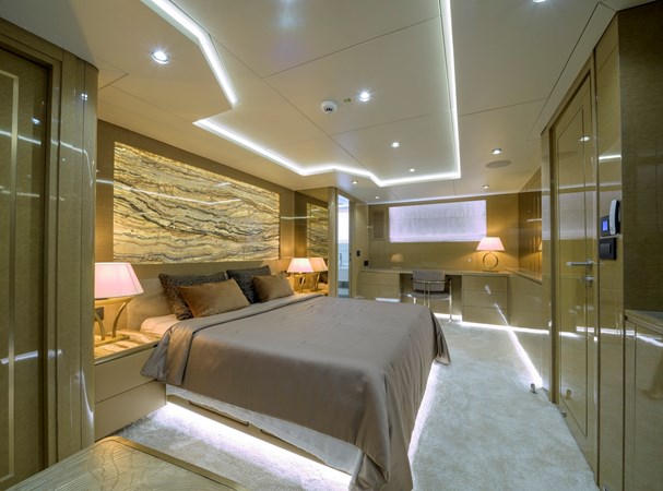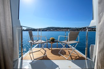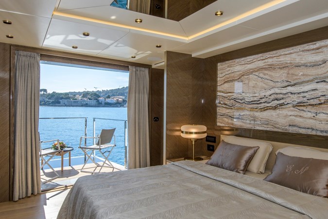 Her beautifully styled interior is light-filled and contemporary, offering a large salon, an elegant indoor dining area, and a fully equipped bar. Accommodation is designed for up to 10 guests in five luxurious cabins, including two master suites—one full-beam on the main deck forward and the other on the upper deck—as well as a full-beam VIP cabin and two twin cabins on the lower deck.