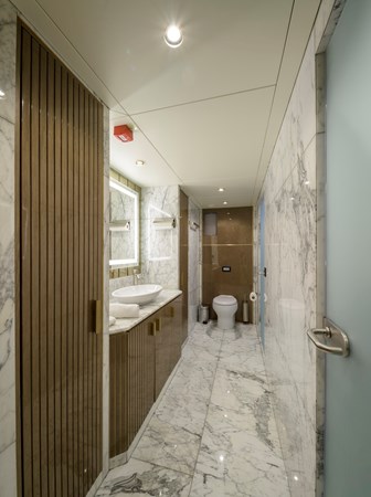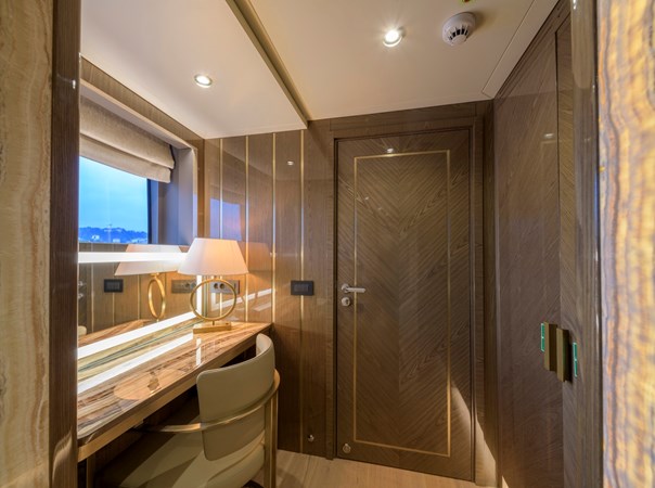 Powered by twin MAN 1,300HP engines, EBYSHINE reaches a top speed of 13.5 knots and cruises comfortably at 10 knots, with an outstanding range of 4,000+ nautical miles. She is equipped with CMC zero-speed stabilisers for enhanced comfort underway and at anchor, and is RINA classified for short-range charter.