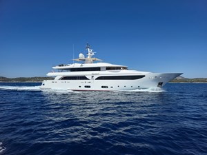 Key features include a fold-down transom beach club, gym with sauna, and expansive hull-side windows in guest suites. Built by CRN Ancona to ABS and RINA standards, she offers reduced maintenance costs.