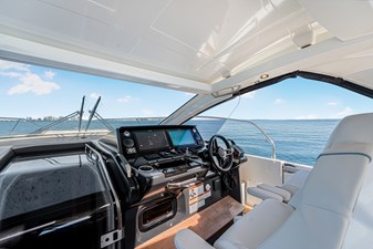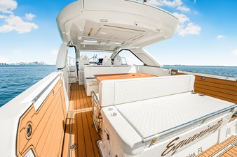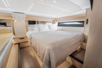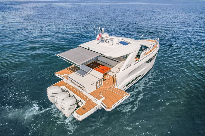 Jeanneau's DB43, A uniquely designed cruiser for the day, the week, or even longer. Jeanneau developed this boat for the experienced yachtsman along with the novice boater. Easily handled by an individual or the family, the DB43 makes all of it a pleasing experience. It is a very sporty and responsive driving experience, with top speeds close to 40 knots. The seakeeping stability is amazing on the DB43, with a hull design by Michael Peters, coupled with the factory installed Sea Keeper adds even more stability. The pleasant and esthetically distinguished profile sets the DB43 apart from many other boats. The Helm has seating for 3, two to starboard at the driving station, 1 to port, with a Retractable Hardtop Separating the Helm from the Cockpit, a Center Island houses, a Refrigerator, Ice maker, Stove Top & Grill, Shelving Storage, Pop Up Accent Lighting, and more, in an Air-conditioned environment. Moving back to the cockpit, you have adjustable Seating Facing Forward for Viewing or Aft to the almost Full Beam Teak Dining Table. Then all the way Aft you have another Forward-Facing Seat for Viewing and Dining. Above the Center Island and Facing Aft is a Drop-Down Television for all of the aft seating to enjoy a movie or a game. Additionally, there are Port and Starboard terraces that open up to expand the entire Aft Cockpit area for swimming or viewing the Sunrise and Sunset with a cup of tea. The Helm and Cockpit areas offer expanded living spaces for everyone on board. On the bow there is Sunbathing for 3 and seating with a table. This area can also be covered with the Sun Tarp for shade. Going Below, there is a small hallway area that leads to the Forward Master with an Island Bed and a Jack & Jill Door to the Head, to Starboard there is the door for the Head and a door to the Aft Stateroom. Also in the hallway is a Microwave, Refrigerator and more Storage Drawers underneath the Stairs. Additionally, all Battery Controls, Generator Controls, Tank Controls are conveniently placed for quick operation. The head houses a Dry Shower, Vanity and Toilet. Entering the Aft Stateroom, to Starboard is a Couch and to Port is a Queen Bed. there is also a cushion that can fill the area in between the two for a much larger sleeping area than a king bed. With the Outboard Power there is Shallow Draft operation coupled to a Joystick at the Helm along with a Bow Thruster. Operationally this boat is a breeze to drive, and dock. Finally, Electrical Power comes from a Diesel-Powered Onan Generator, housed in an ultra-quiet cabinet keeping engine noise whisper quiet