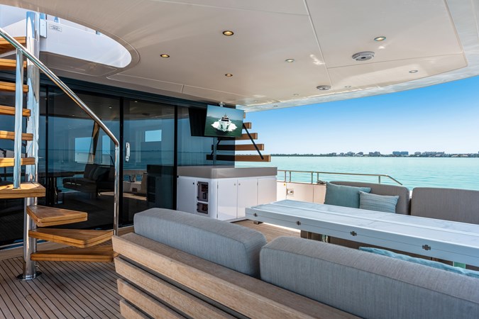 Moving aft again, the stainless-steel-framed sliding glass door creates continuity between indoor and outdoor spaces; the design is meant to open up the internal space at every opportunity.