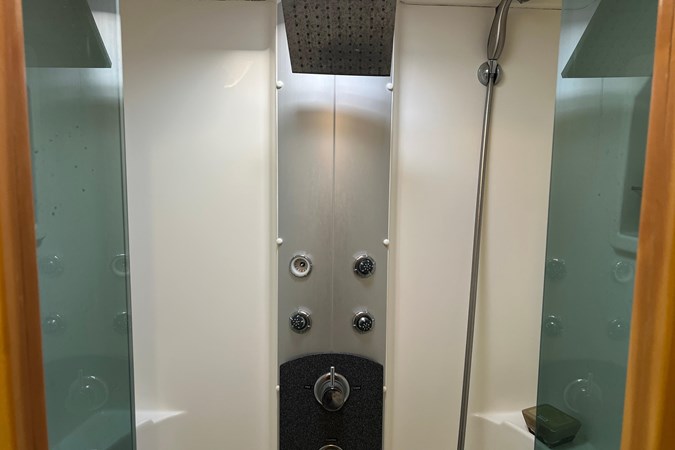 Owners head with rain showerhead forward to starboard