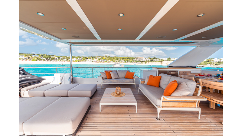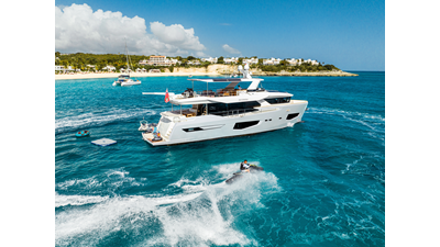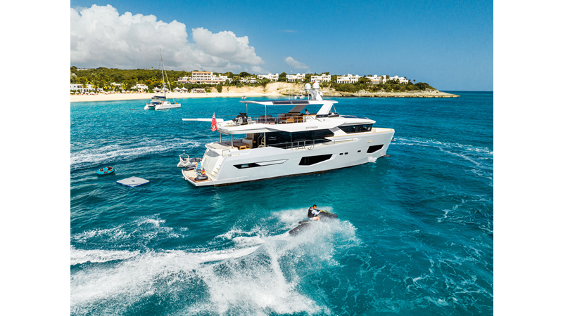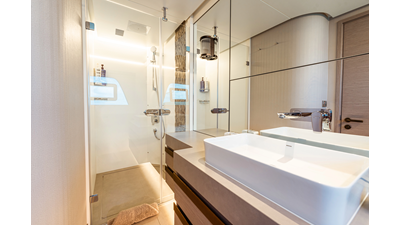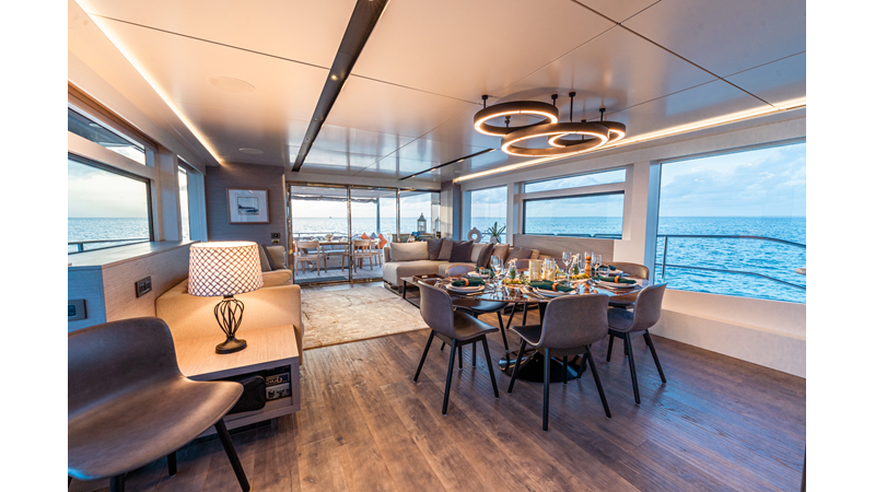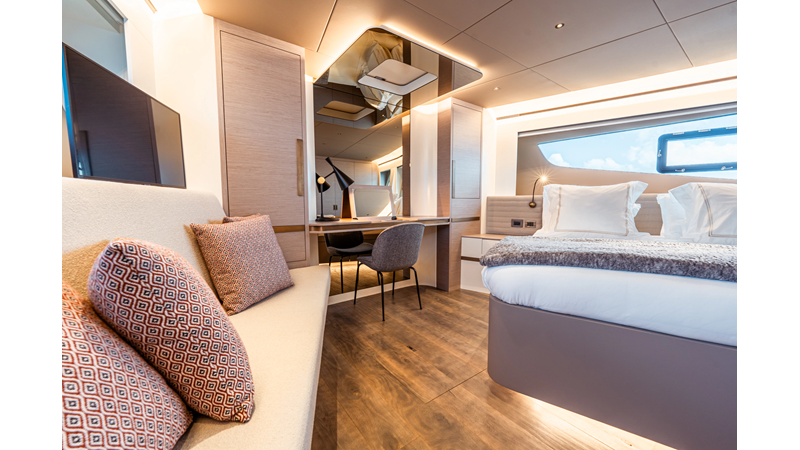 Onboard comfort is further enhanced by the latest-generation electric fin stabilization system, providing exceptional stability both underway and at anchor. The extended flybridge hardtop is equipped with a comprehensive solar energy package and an impressive 80 kW lithium-ion battery bank, forming the Silent Package that allows for silent overnight operation without generator use.