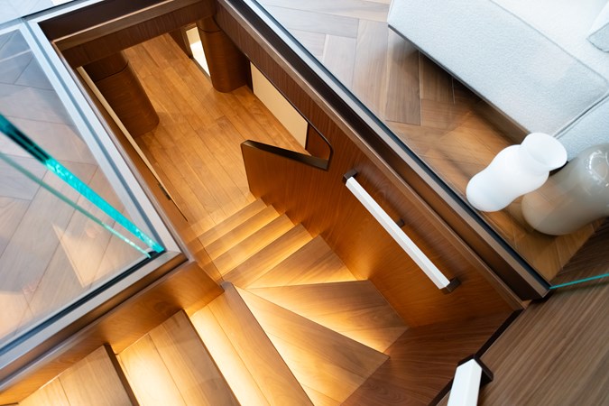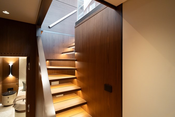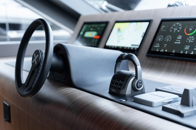 with a cockpit that gently cascades over three levels down to the water. The aft galley connects directly to the exterior via a