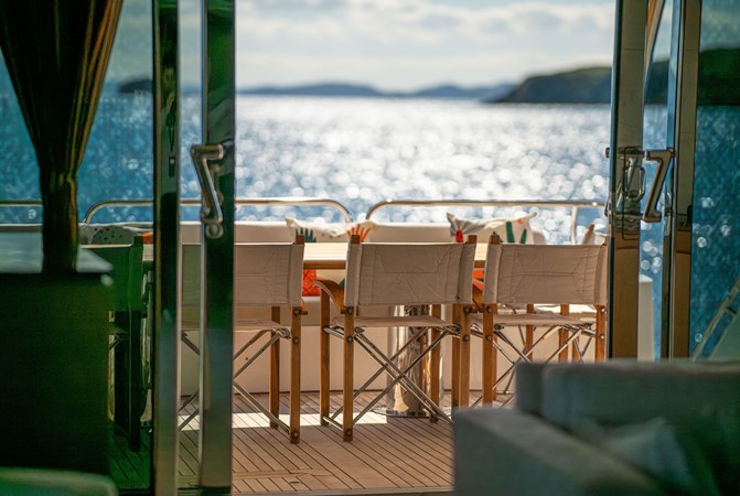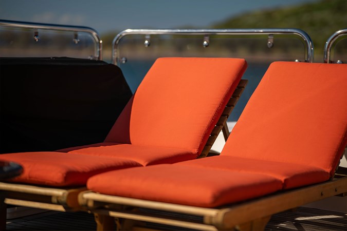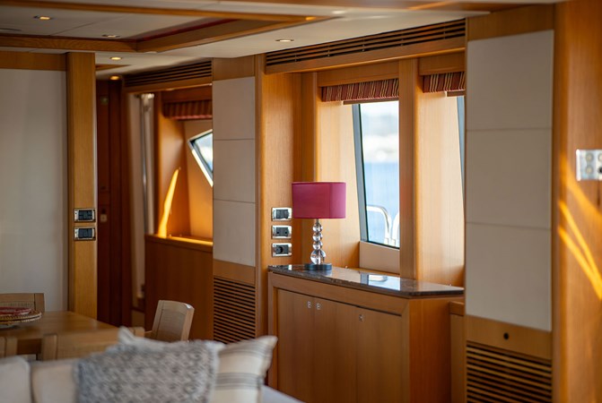 She accommodates up to 10 guests in five well-appointed cabins, including a full-beam master suite on the main deck, one VIP cabin, one double cabin, and two twin cabins. The satin-finished oak interior creates a warm yet contemporary atmosphere, while all cabins feature entertainment systems and en-suite facilities.
