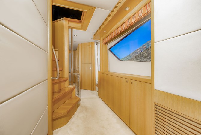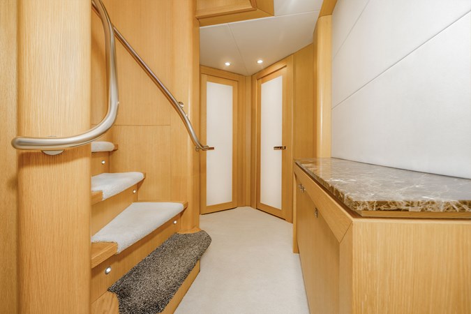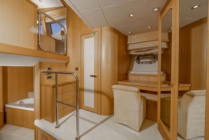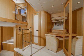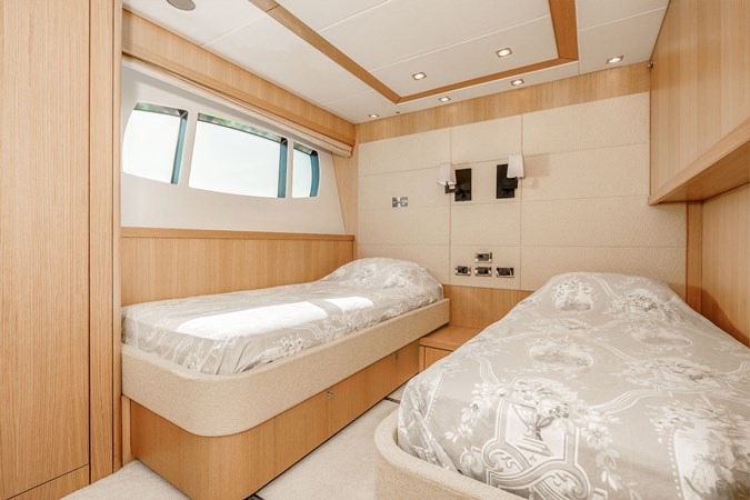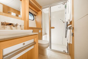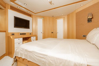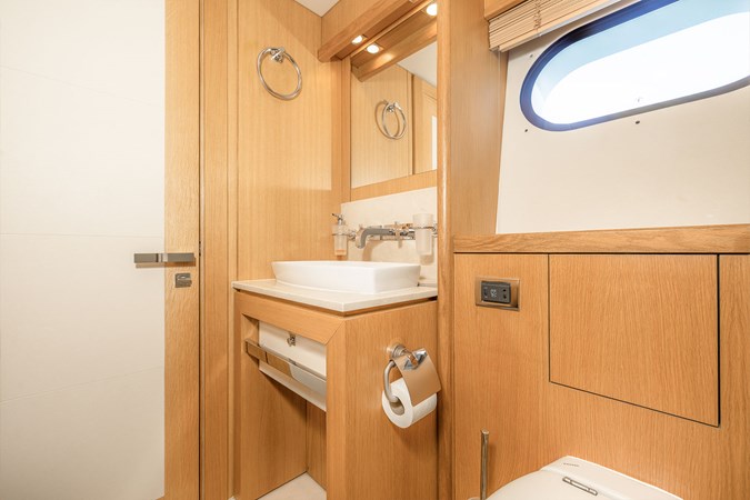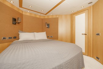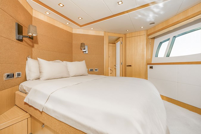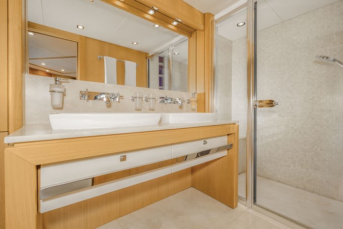 During construction, the original owner requested a significant customization to enhance privacy and spatial comfort within the master suite. The crew area was relocated to the aft section of the yacht, allowing the master cabin to benefit from an enlarged bathroom layout compared to the standard configuration. This bespoke arrangement makes the master suite noticeably more spacious and private than many comparable yachts in her class.