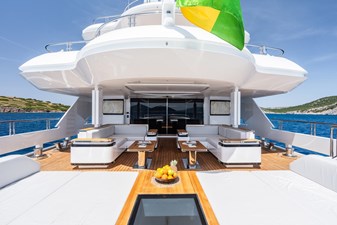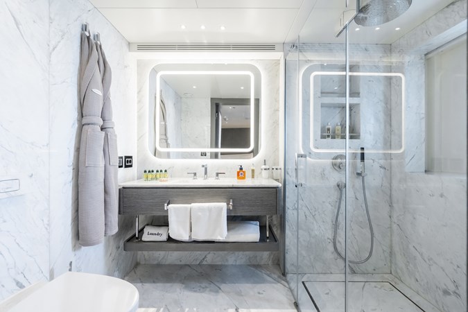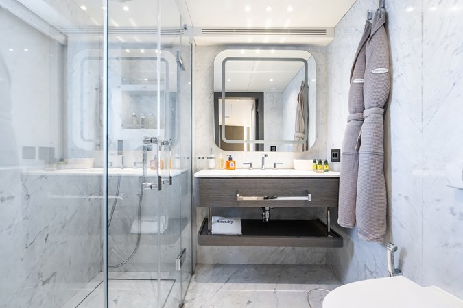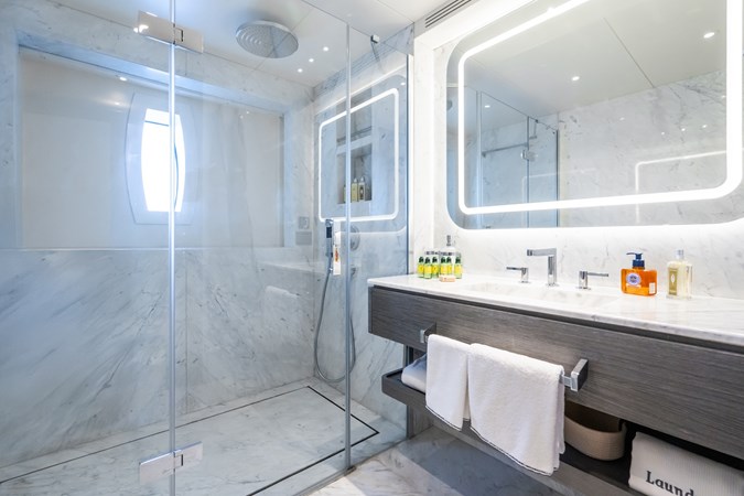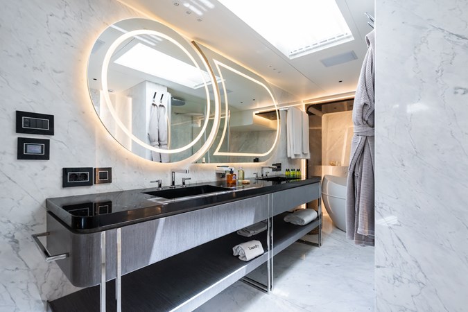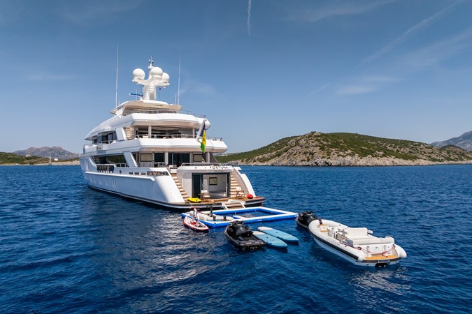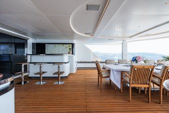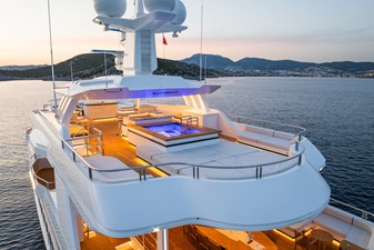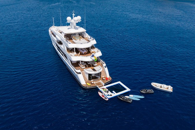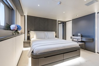 Her four-deck layout is optimised for entertainment, highlighted by a signature sundeck featuring a Jacuzzi with a cascading waterfall, full bar, teppanyaki grill, and a dedicated DJ console with dance floor. At water level, a full-beam beach club and extended hydraulic swim platform create an ideal setting for relaxation and seamless access to watersports.