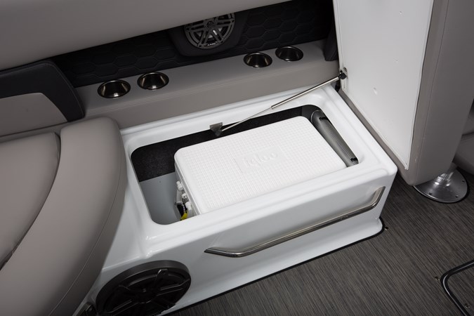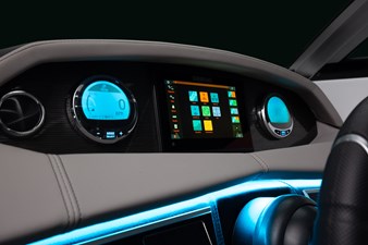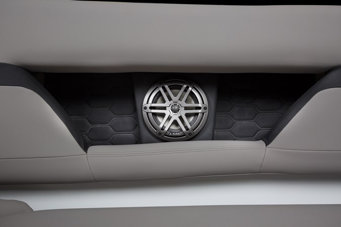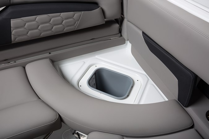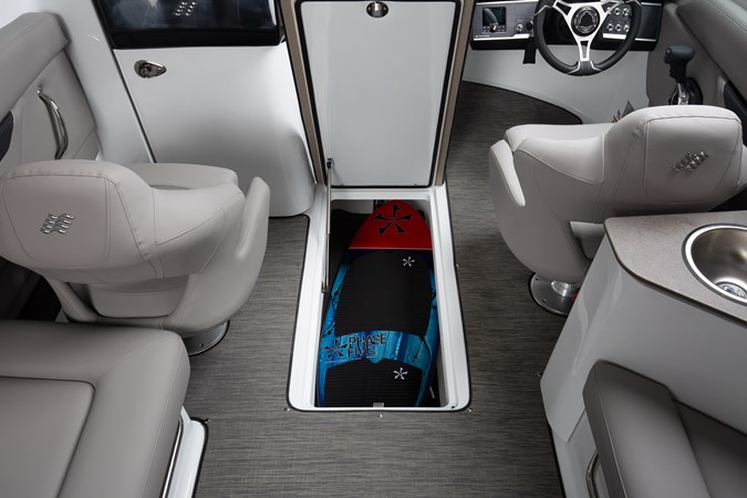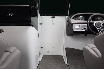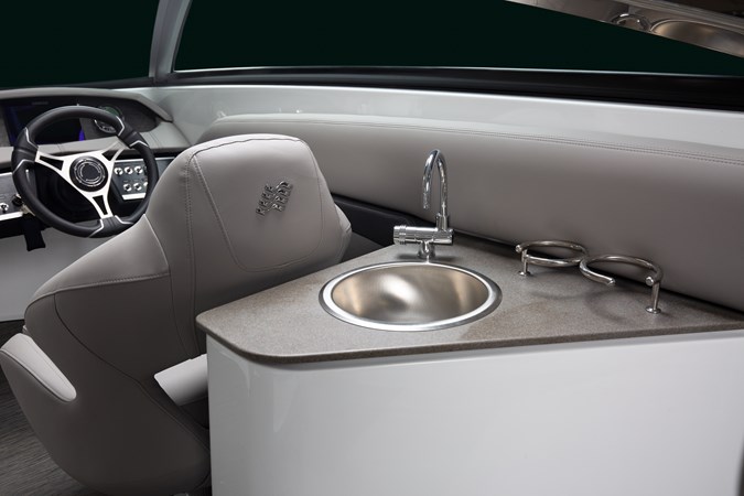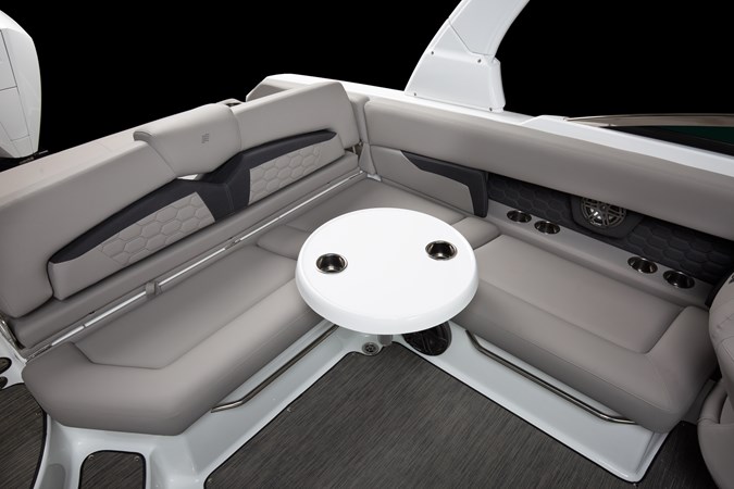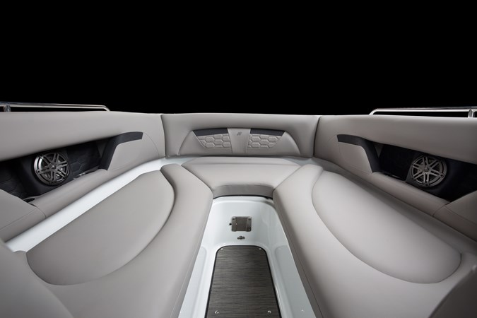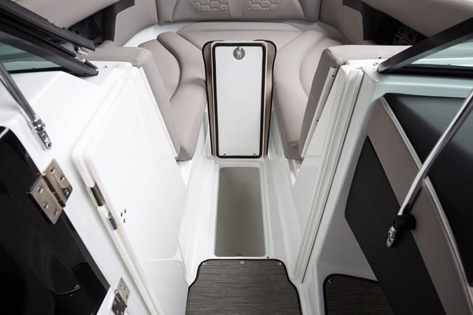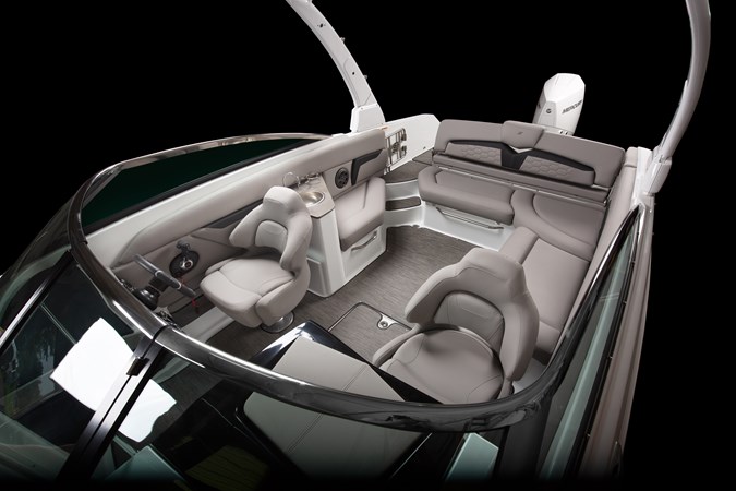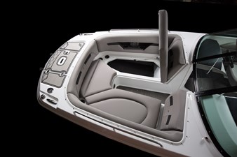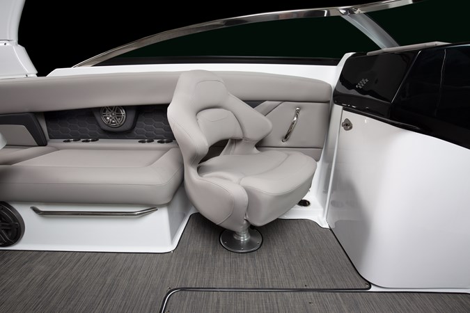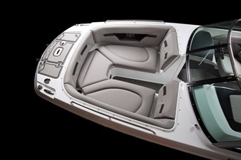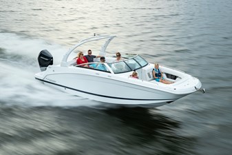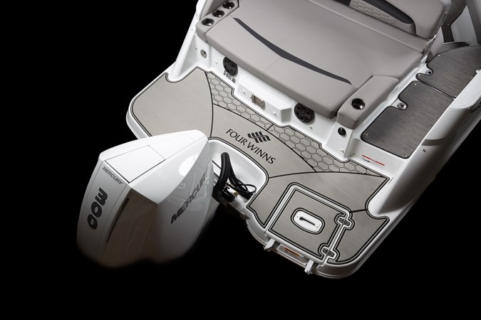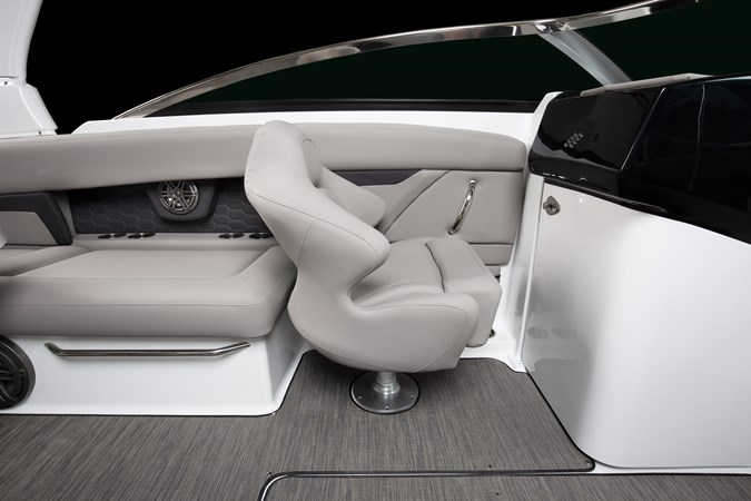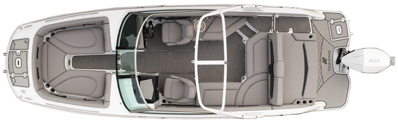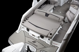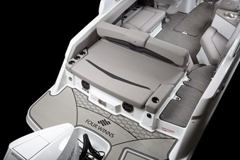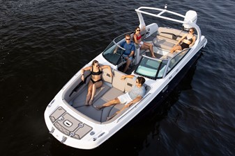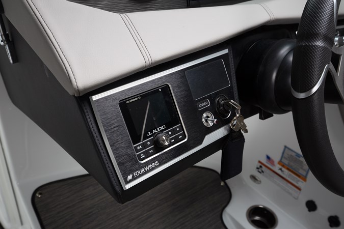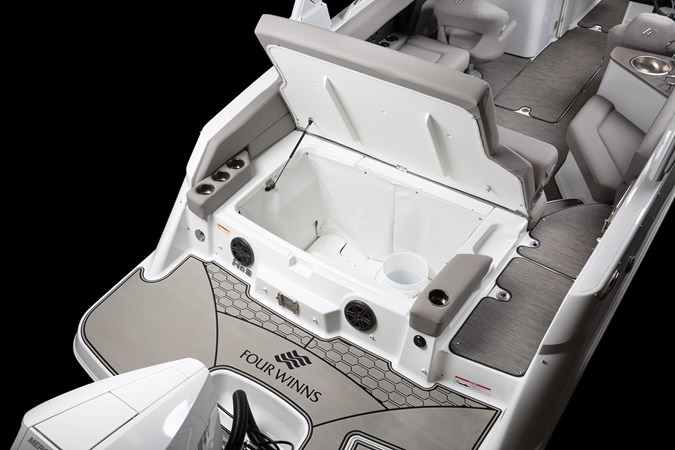 The 2026 Four Winns HD8 is a luxurious 26-foot bowrider designed for both performance and comfort. With a beam of 8'4" and a length overall of 26'6", it offers ample space for up to 12 passengers. The boat features plush seating, including a U-shaped cockpit and a spacious bow area, all upholstered in premium contoured vinyl. Standard amenities include a fully enclosed head with a porta potty, sink, and light, as well as a convertible aft sun lounge. Entertainment options consist of a Bluetooth-enabled stereo system with four speakers and USB ports. For storage, the HD8 is equipped with multiple compartments, including a ski locker and built-in coolers. The helm boasts a hand-wrapped vinyl dash with LED accent lighting, fog-resistant gauges, and a tilt steering wheel. The boat's design is complemented by a sleek exterior available in various color options, including Classic Navy, Crimson Red, Denim Blue, Jet Black, Liquid Blue, and Phantom Grey. With a fuel capacity of 70 gallons and a water capacity of 12 gallons, the HD8 is well-suited for extended outings on the water.