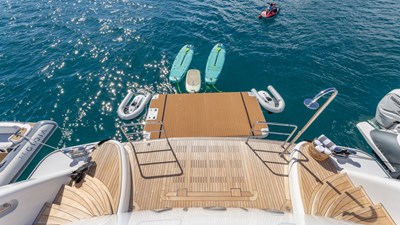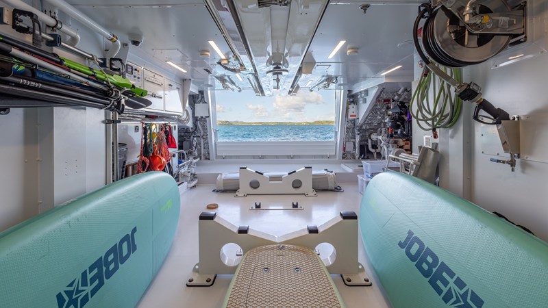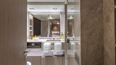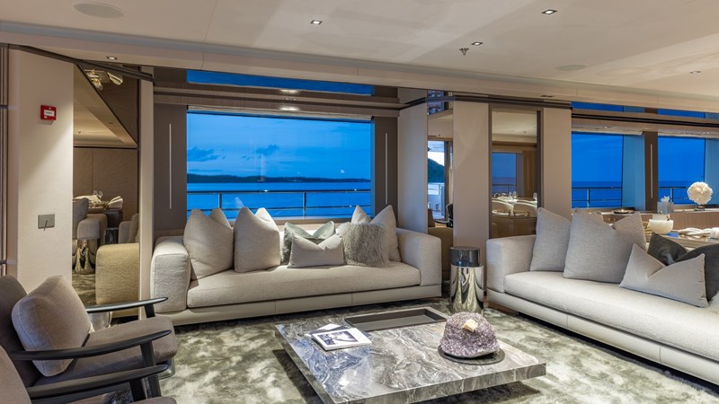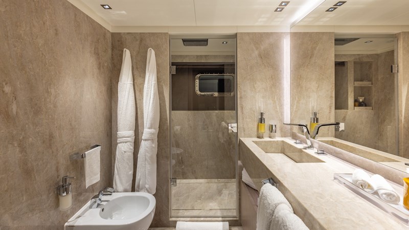 Accommodating up to 12 guests in five spacious cabins, GIOIA offers generous areas for relaxation and entertainment. The full-beam master suite is located on the main deck and includes a private lounge, his-and-hers walk-in wardrobes, and a his-and-hers bathroom. Four additional guest cabins are situated on the lower deck, including two double cabins and two twin cabins with Pullman bunks – all appointed with en suite bathrooms.