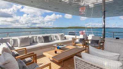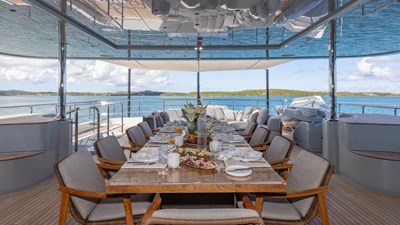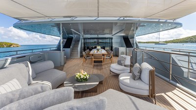 GIOIA’s exterior decks offer multiple lounging and entertainment options for life at sea. The expansive sun deck features a raised jacuzzi, generous sunpads, a full wet bar, and an aft seating area. The bridge-deck aft hosts a spacious al fresco dining area, while further lounging spaces can be found on the main-deck aft and foredeck, providing a variety of settings throughout the day.