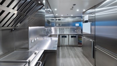 Twin Caterpillar C32 engines deliver a maximum speed of 16.5 knots and a cruising speed of 11 knots, with a transatlantic range of 4,000 nm.