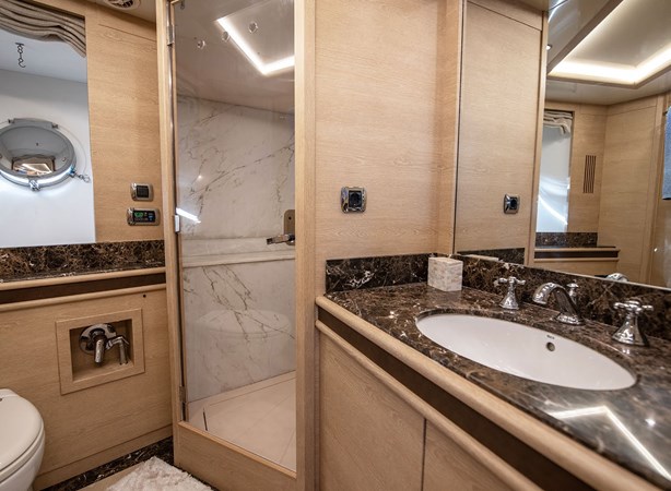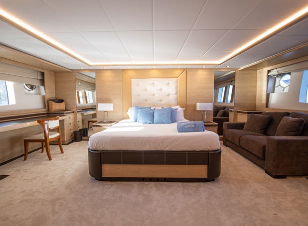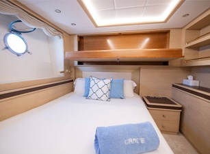 The full-beam master suite, accessed via a private staircase, serves as the main stateroom, while the VIP cabin provides ample space and luxury. A well-appointed double cabin and a twin cabin with an additional Pullman berth ensure flexible sleeping arrangements. For the crew, separate quarters with independent access accommodate up to 4 members, allowing for discreet service and privacy for guests.