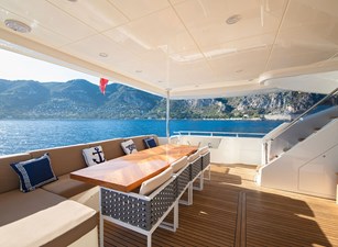 The aft deck provides additional dining space and comfortable seating, while the bow area boasts sunbeds with an awning for shade, offering another idyllic spot to unwind while taking in breathtaking views.