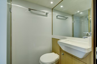 The interior is finished in satin Light Oak with upgraded “Platinum” leather upholstery and enhanced carpeting. The saloon is bright and open with multiple lounging spaces. The galley and dinette feature Wenge wood flooring and can be closed off for privacy.