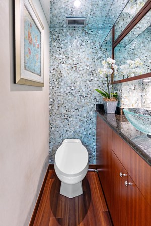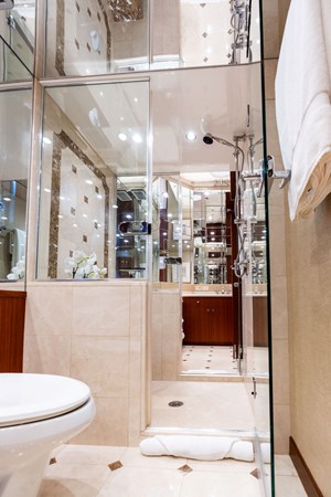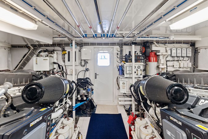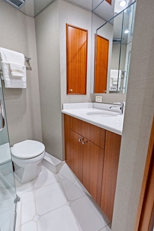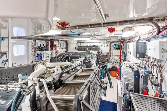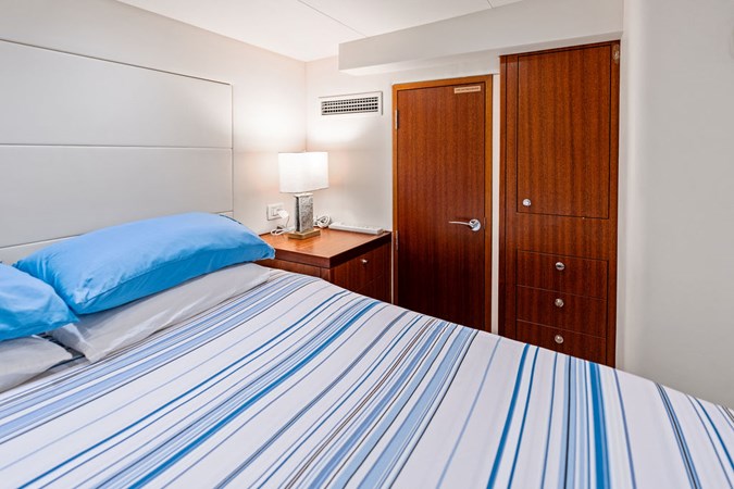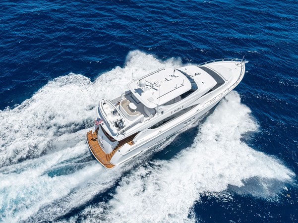 On her main deck she offers an aft area for alfresco dining, a wide body salon with ample area for entertaining or relaxing and a large, well equipped galley. The expansive, enclosed flybridge is open to the helm area and offers an air-conditioned luxurious second salon for relaxing or entertaining with panoramic views of the water. Aft of the enclosed bridge is an outdoor seating area and electric grill, with the tender and hydraulic davit. Below deck offers a full beam master, a spacious VIP forward, a full size guest stateroom to port and a twin guest stateroom to starboard. All staterooms are en suite. The spacious engine room and crew quarters are aft of the staterooms.
