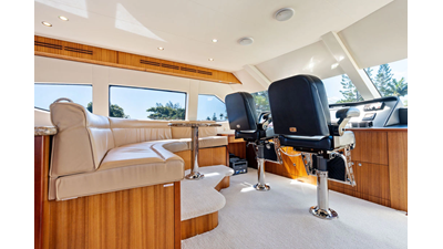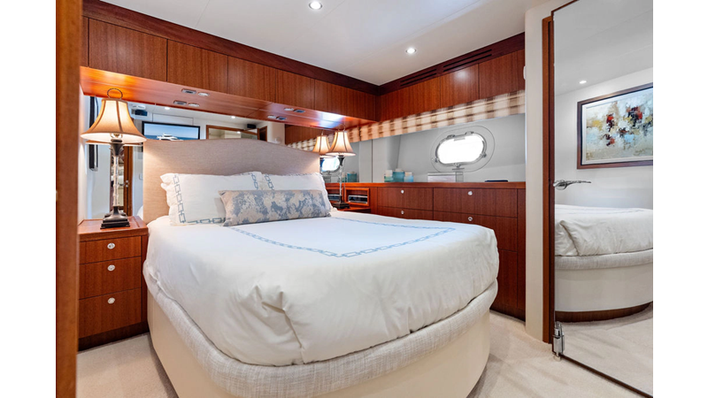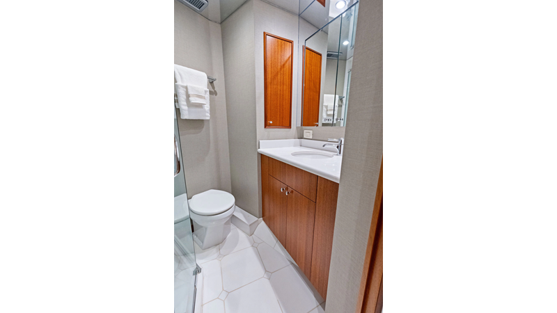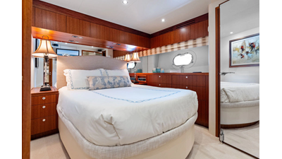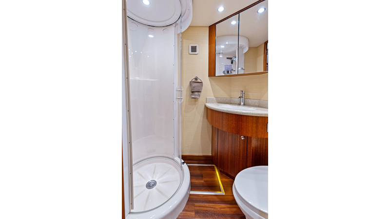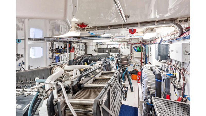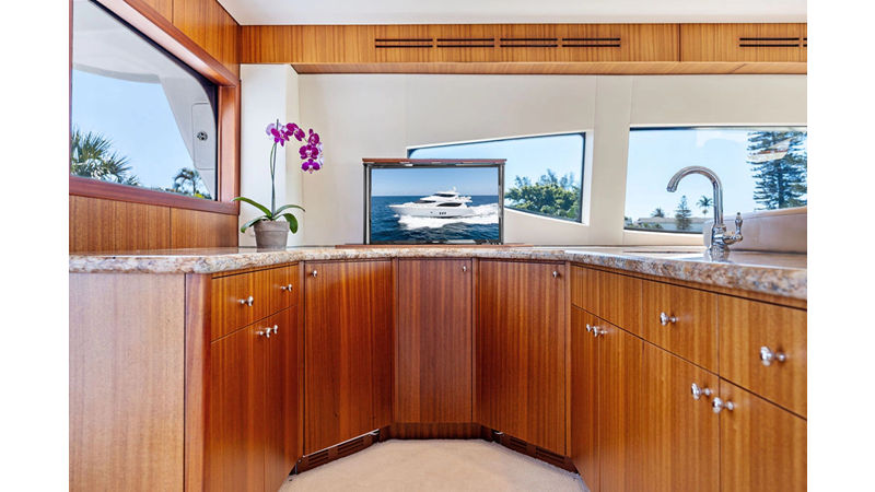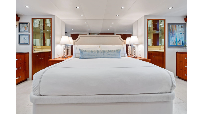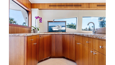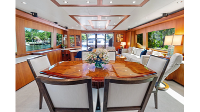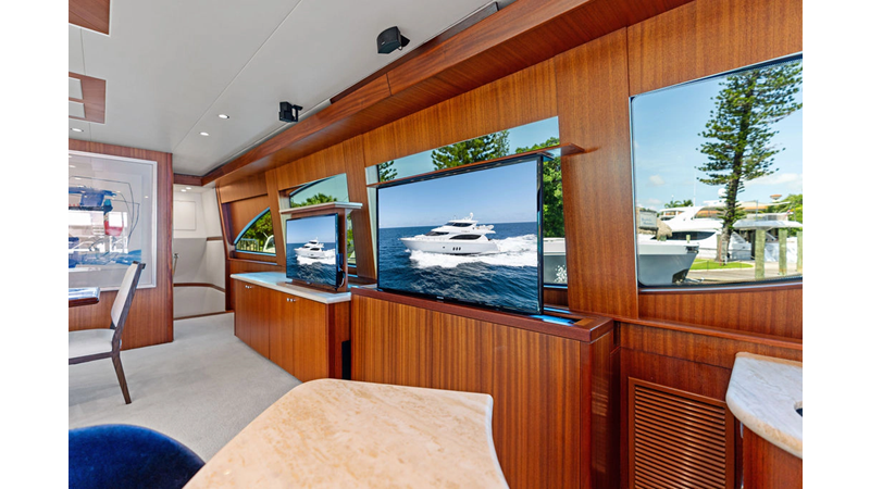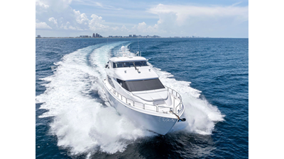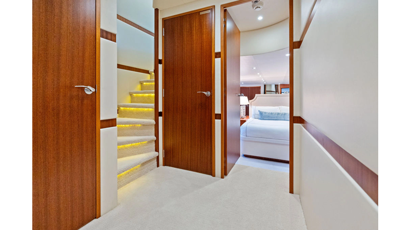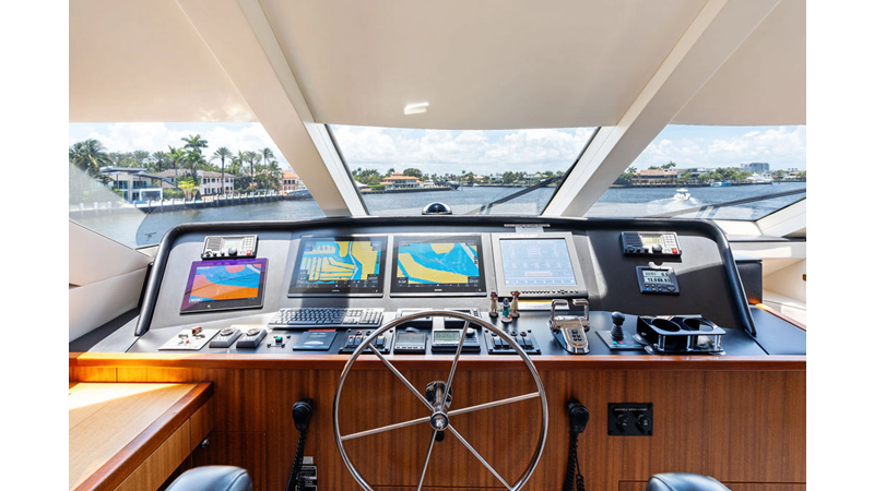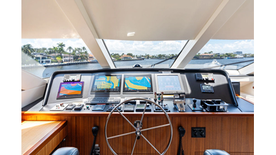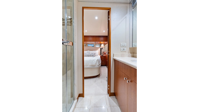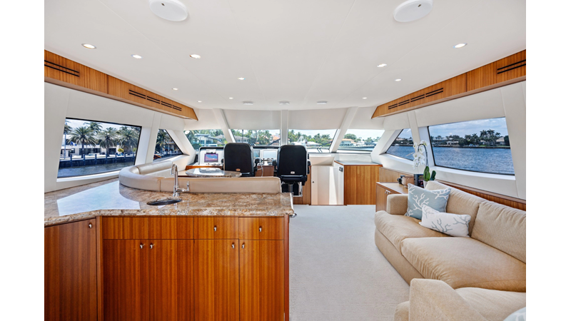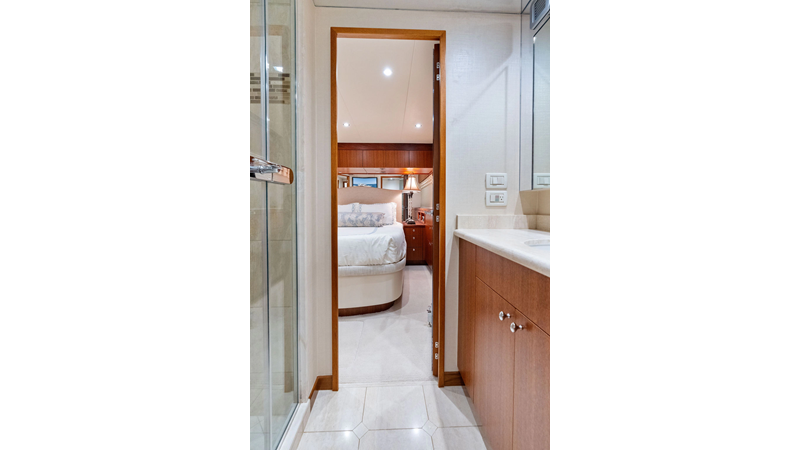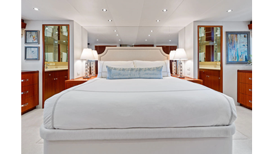 On her main deck she offers an aft area for alfresco dining, a wide body salon with ample area for entertaining or relaxing and a large, well equipped galley. The expansive, enclosed flybridge is open to the helm area and offers an air-conditioned luxurious second salon for relaxing or entertaining with panoramic views of the water. Aft of the enclosed bridge is an outdoor seating area and electric grill, with the tender and hydraulic davit. Below deck offers a full beam master, a spacious VIP forward, a full size guest stateroom to port and a twin guest stateroom to starboard. All staterooms are en suite. The spacious engine room and crew quarters are aft of the staterooms.