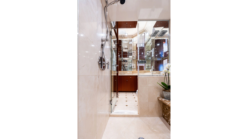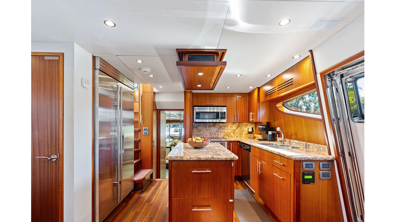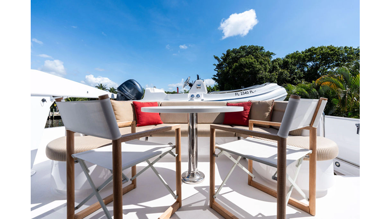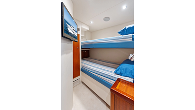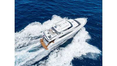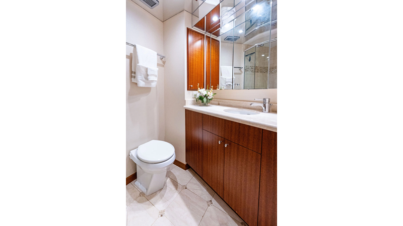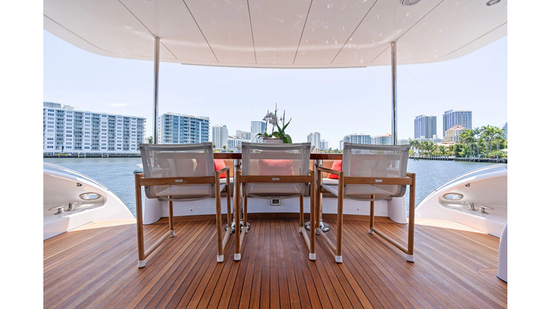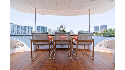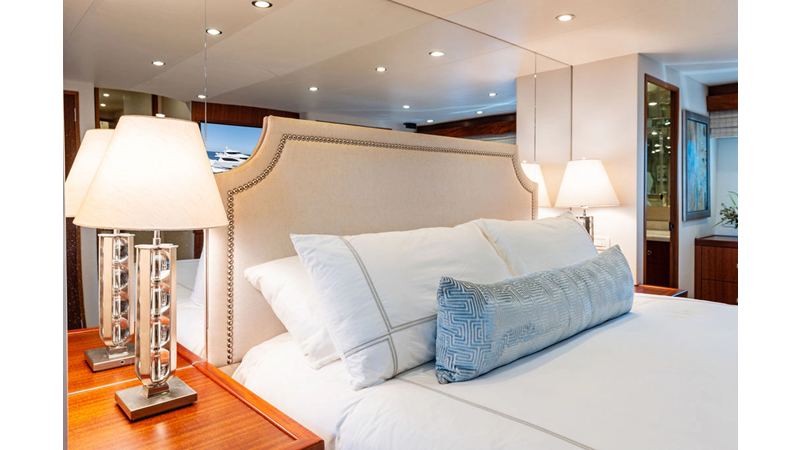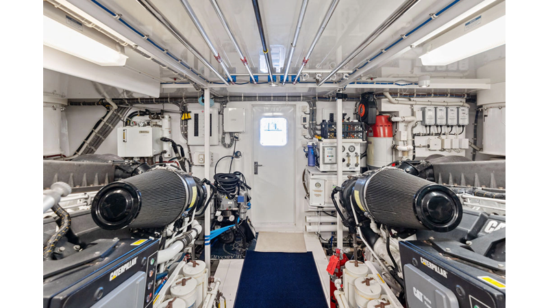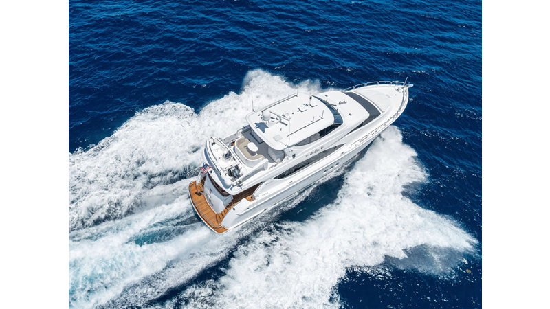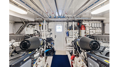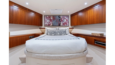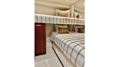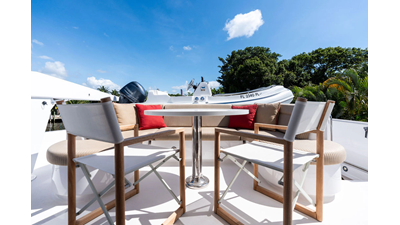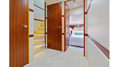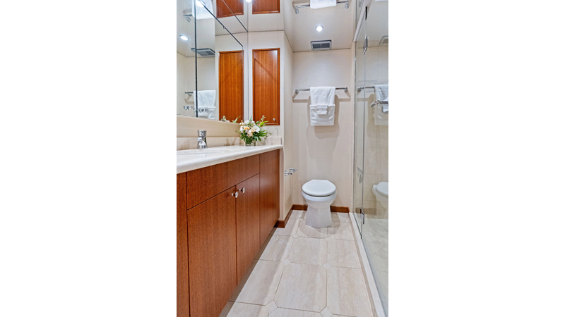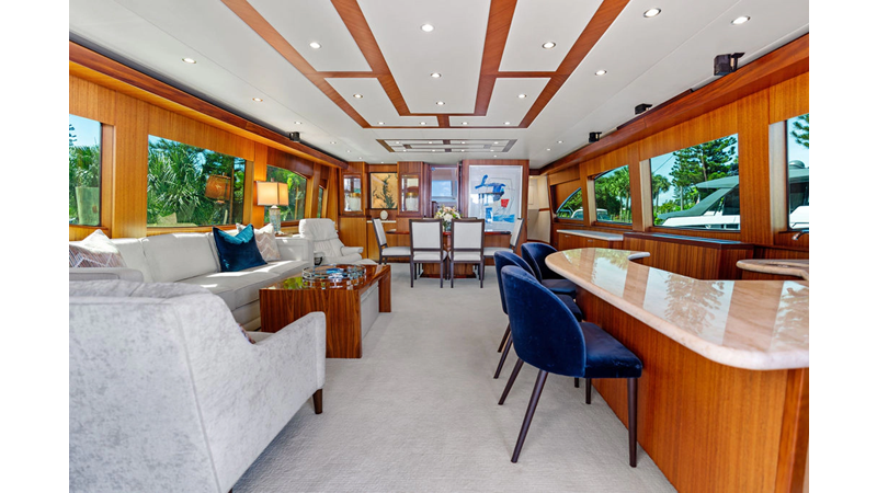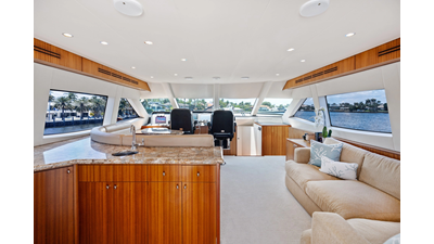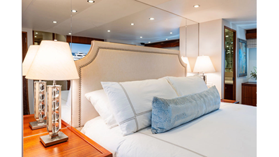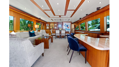 On her main deck she offers an aft area for alfresco dining, a wide body salon with ample area for entertaining or relaxing and a large, well equipped galley. The expansive, enclosed flybridge is open to the helm area and offers an air-conditioned luxurious second salon for relaxing or entertaining with panoramic views of the water. Aft of the enclosed bridge is an outdoor seating area and electric grill, with the tender and hydraulic davit. Below deck offers a full beam master, a spacious VIP forward, a full size guest stateroom to port and a twin guest stateroom to starboard. All staterooms are en suite. The spacious engine room and crew quarters are aft of the staterooms.