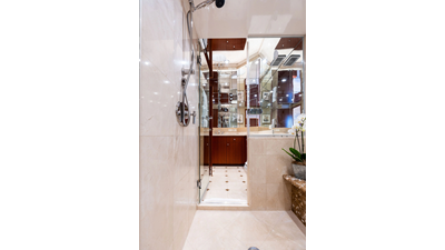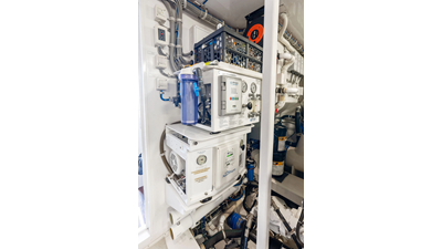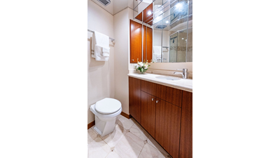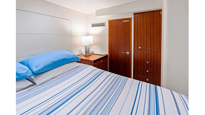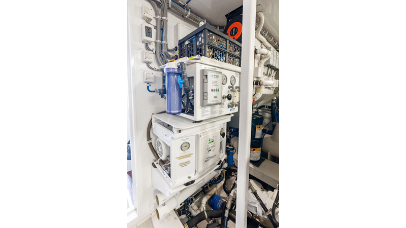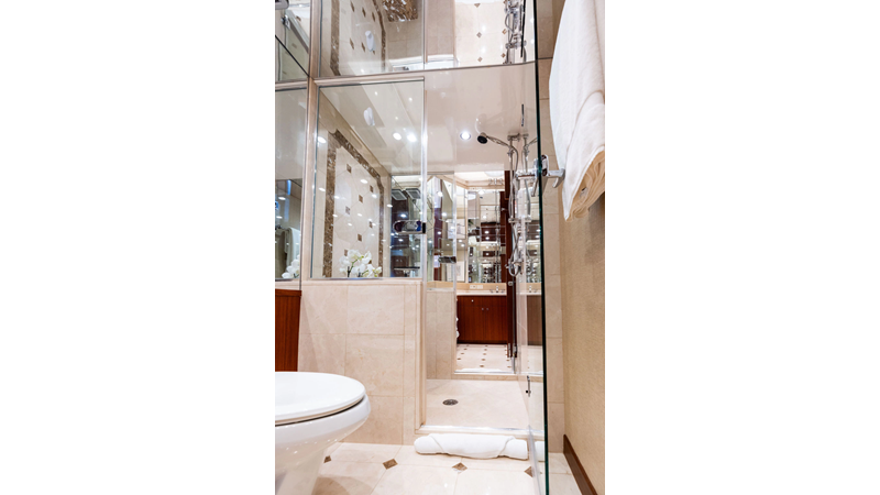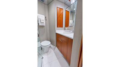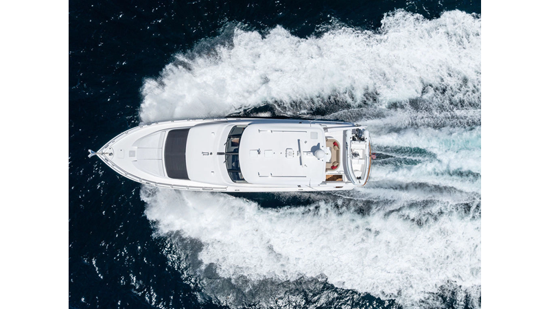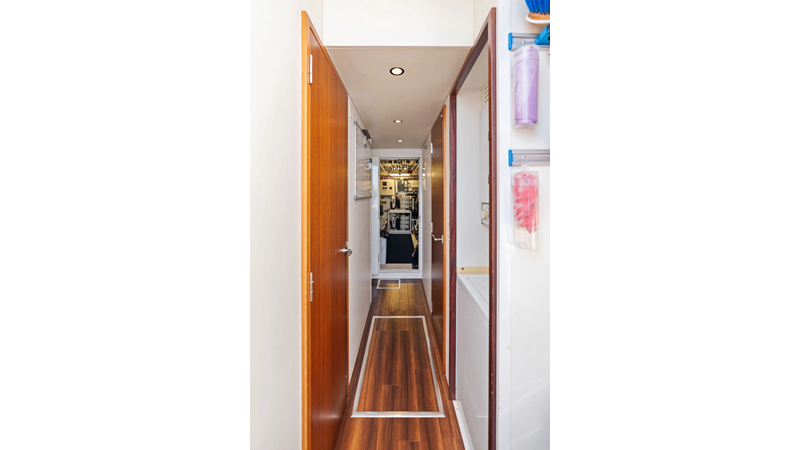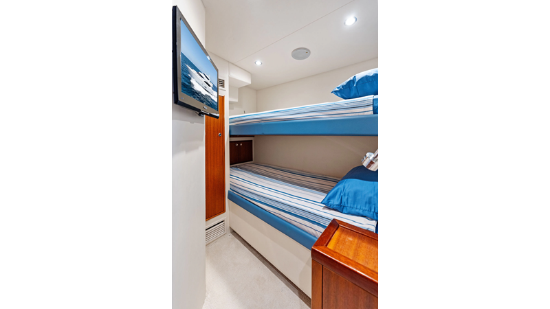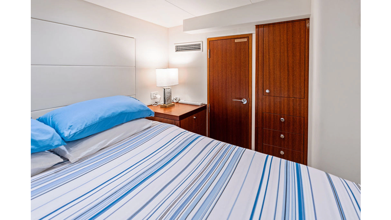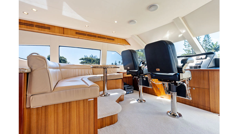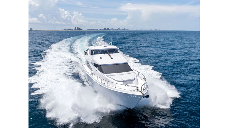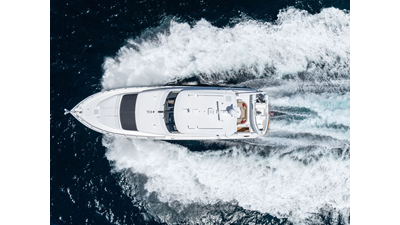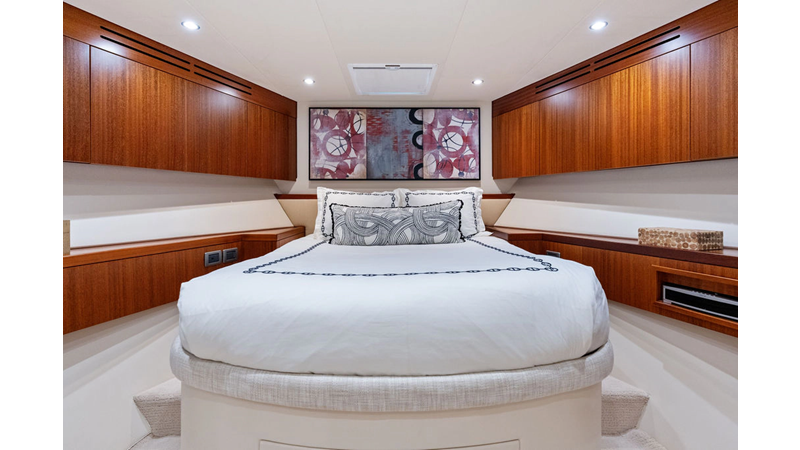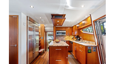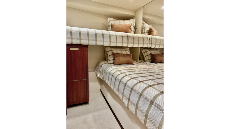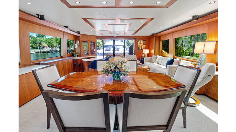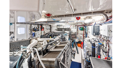 On her main deck she offers an aft area for alfresco dining, a wide body salon with ample area for entertaining or relaxing and a large, well equipped galley. The expansive, enclosed flybridge is open to the helm area and offers an air-conditioned luxurious second salon for relaxing or entertaining with panoramic views of the water. Aft of the enclosed bridge is an outdoor seating area and electric grill, with the tender and hydraulic davit. Below deck offers a full beam master, a spacious VIP forward, a full size guest stateroom to port and a twin guest stateroom to starboard. All staterooms are en suite. The spacious engine room and crew quarters are aft of the staterooms.