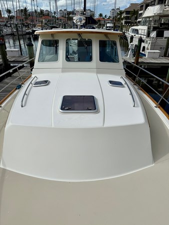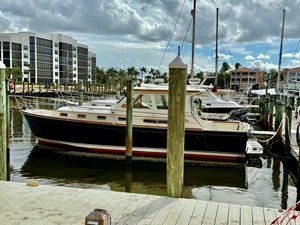 The interior has cherry cabinetry and bulkheads and a teak and holly sole throughout. There is a center island master berth with a new custom-built queen mattress forward, cabinets outboard and under the berth, and a cedar-lined hanging locker. The stainless steel opening portholes and overhead hatch provide light and ventilation when the air conditioning is not in use. The head is aft to port with a double entry from the stateroom and the main salon. In the head there is a Corian vanity sink with hot and cold water, an electric head, and a shower. Next is the main salon with a U-shaped dinette (that converts to a double berth) and a cherry dining table with inlaid birds-eye maple. There are shelves outboard and storage under the dinette. A flat screen television is located on the forward starboard bulkhead. GULF KART lll has a full U-shaped sea galley with Corian countertops to port. Up three steps to the helm deck is her command station to starboard with a mahogany tilt steering wheel, full electronics console, and Stidd Ultraleather captain's chair. To port is the comfortable raised L-settee with a pedestal teak table. There are opening windows on all three sides of the helm deck. Down one step is the roomy aft cockpit bench seat along the transom, and an aft facing bench seat.