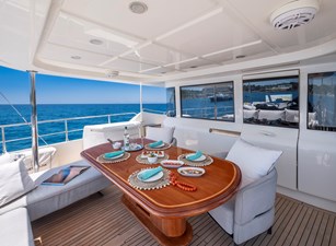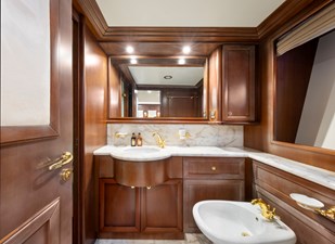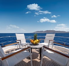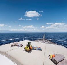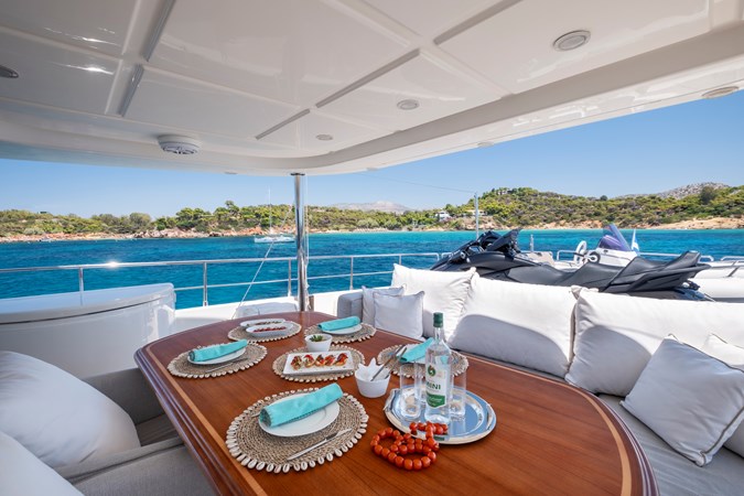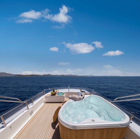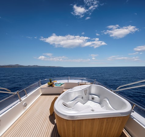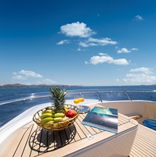 The upper deck provides a TV lounge and ample seating and lying areas on deep sofas. On deck features include a sundeck Jacuzzi – next to a set of free weights! Al fresco dining is enjoyed on the aft deck, well protected under the substantial overhang.