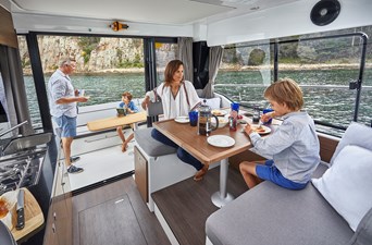 The 2025 Jeanneau NC1095 Fly is a modern 34-foot flybridge cruiser designed for comfortable extended cruising and family adventures. It features a spacious layout with either two or three double cabins, accommodating up to six people. The main deck offers a bright salon with large windows, a fully equipped galley, and an aft cockpit that seamlessly connects to the interior. The standout feature is the expansive flybridge, which includes a helm station, forward sundeck, and a folding copilot bench that transforms into a sun lounger or additional seating area. This upper deck provides panoramic views and an elevated space for relaxation and socializing.