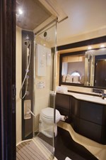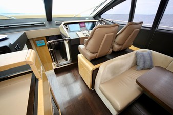 This Azimut 66 Flybridge can easily sleep 8 guests with 2 additional crew berths. Below deck, the full-beam master cabin features panoramic windows, a queen berth, a spacious vanity, and a large ensuite with a rainfall shower. The VIP cabin forward is filled with natural light and features its own ensuite and ample storage. Two twin guest cabins—one with side-by-side berths and one with bunks—share the third head, which also functions as a day head. A Miele washer and dryer set is conveniently located in the companionway.