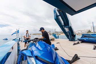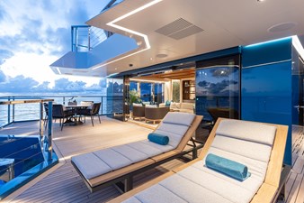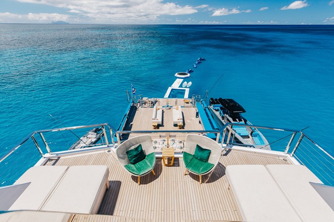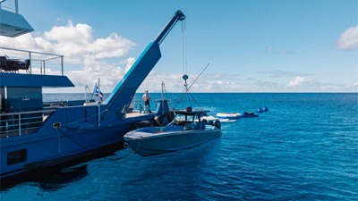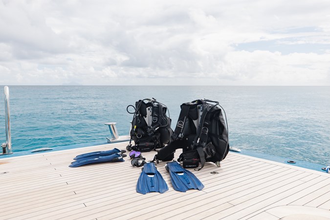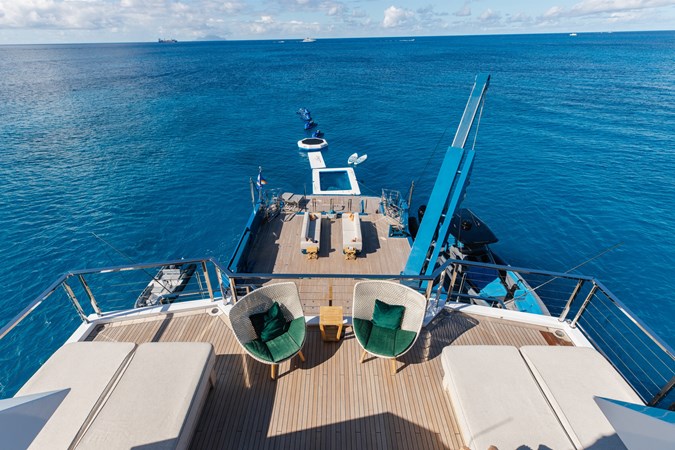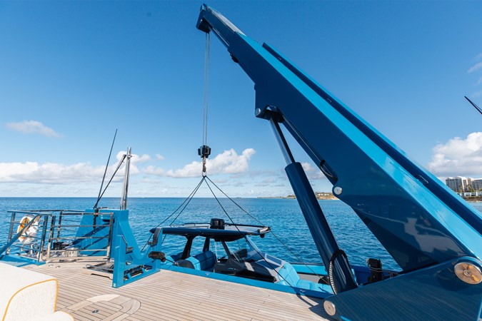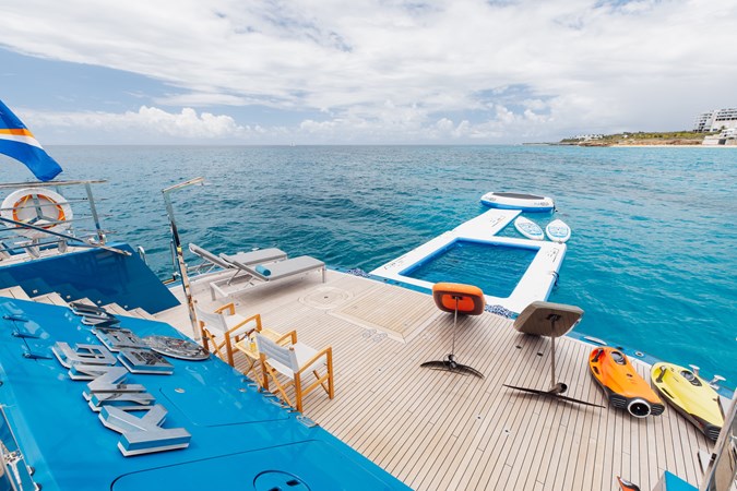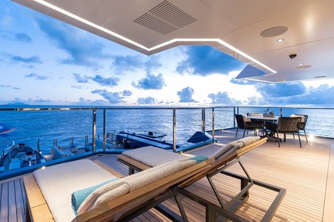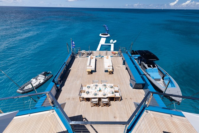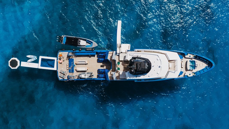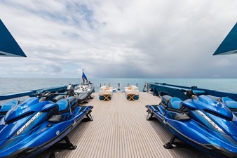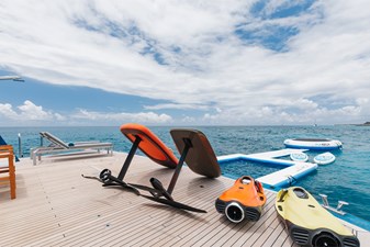 The expansive aft deck with a 10-tonne crane doubles as a lounge and adventure hub, carrying a 12m Nor-Tech tender, jet skis, eFoils, Seabobs, scuba and sportfishing gear, towables, floating platforms, a giant waterslide, and climbing frame.