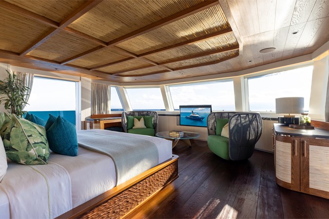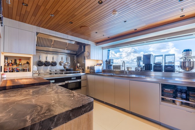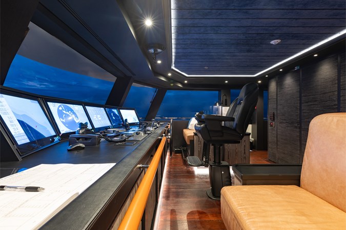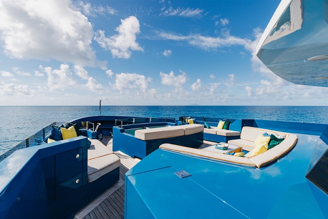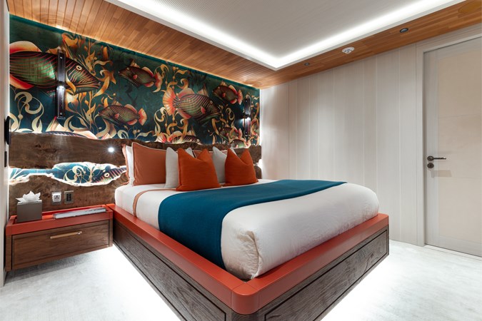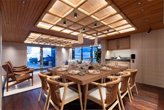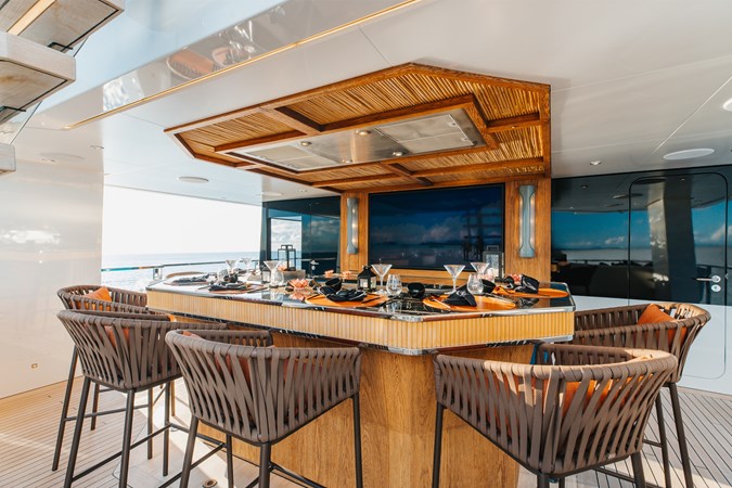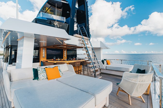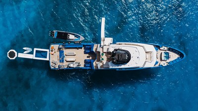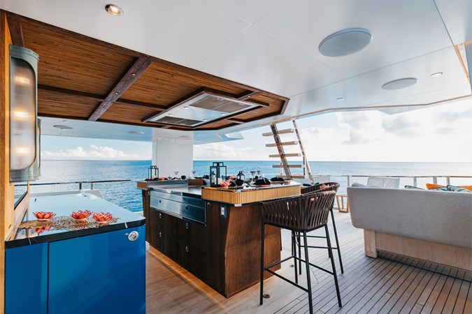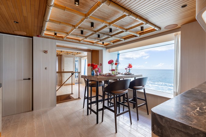 Conceived by designer Greg Marshall, KING BENJI reimagines the 45m explorer Big Fish. The yacht centers social life around an elevated teppanyaki bar with sweeping views, offers 10 dining areas, a crow’s nest with 360° panorama, and large window seating with cinematic ocean views. The owner’s deck connects fore and aft for natural airflow and features an outdoor rain shower and Japanese-style hot-and-cold plunge pools overlooking the bow.