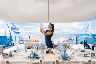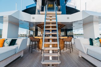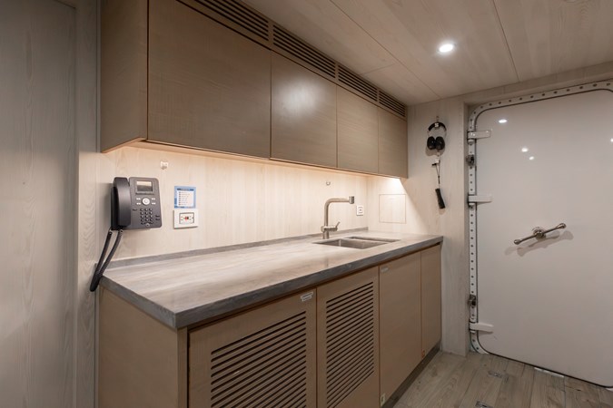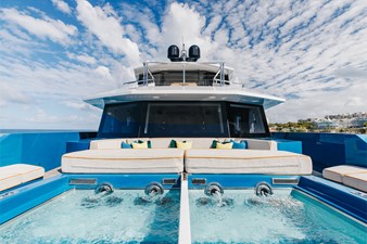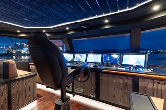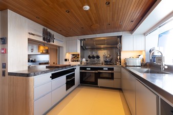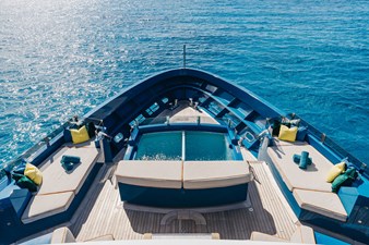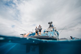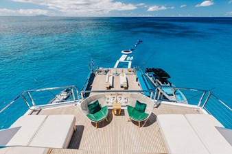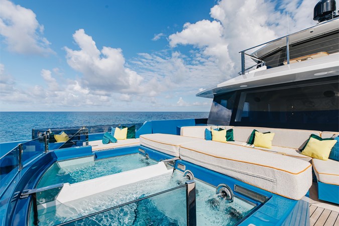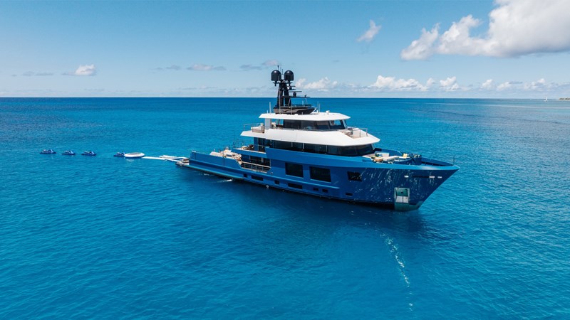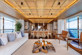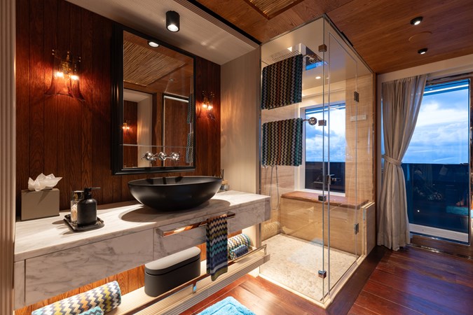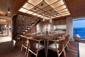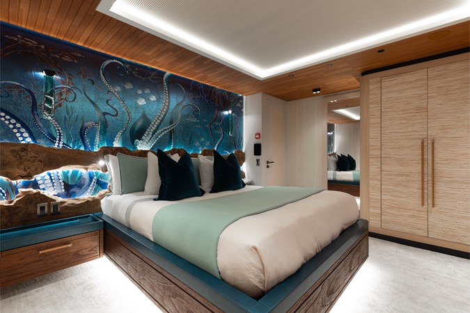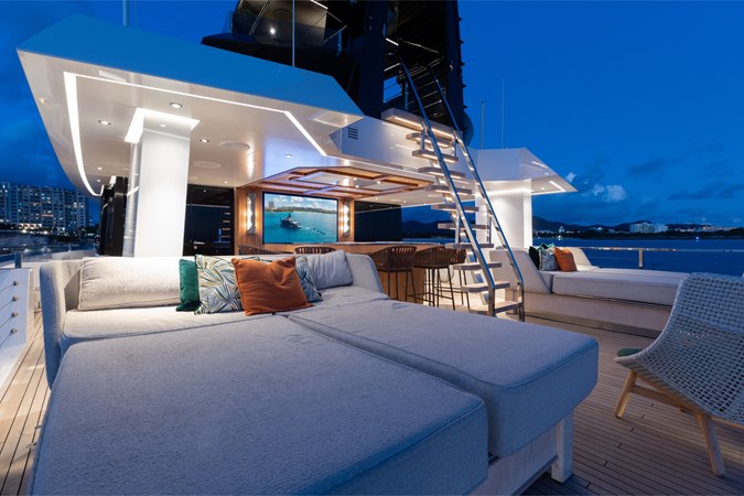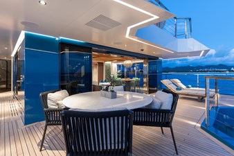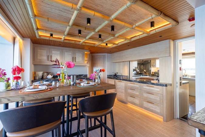 Conceived by designer Greg Marshall, KING BENJI reimagines the 45m explorer Big Fish. The yacht centers social life around an elevated teppanyaki bar with sweeping views, offers 10 dining areas, a crow’s nest with 360° panorama, and large window seating with cinematic ocean views. The owner’s deck connects fore and aft for natural airflow and features an outdoor rain shower and Japanese-style hot-and-cold plunge pools overlooking the bow.