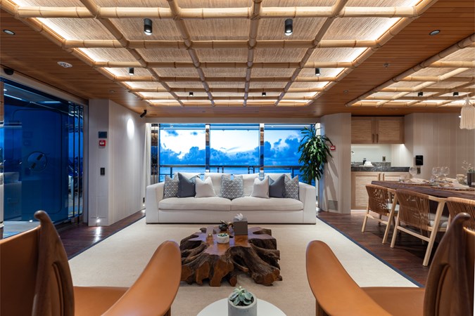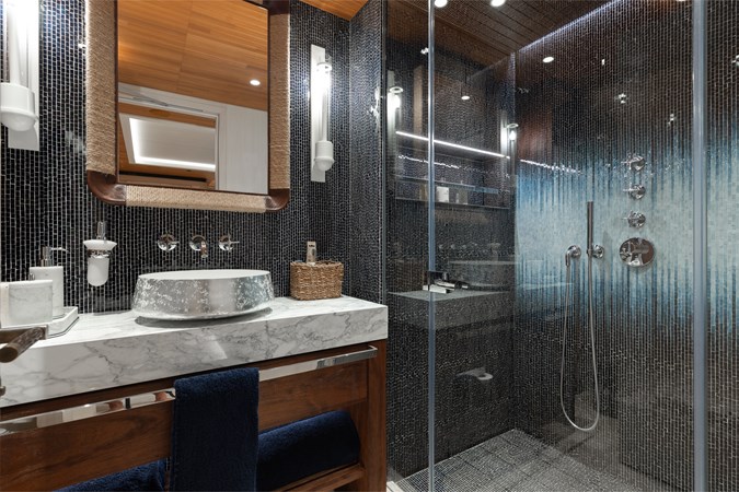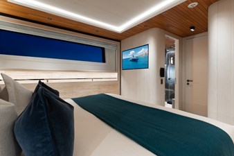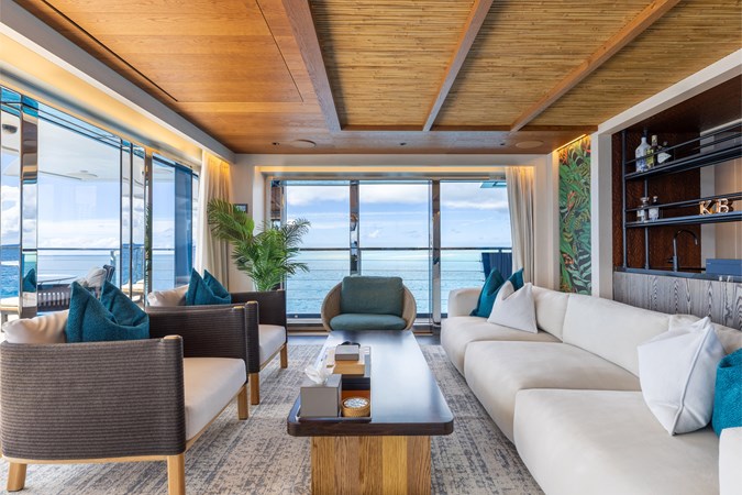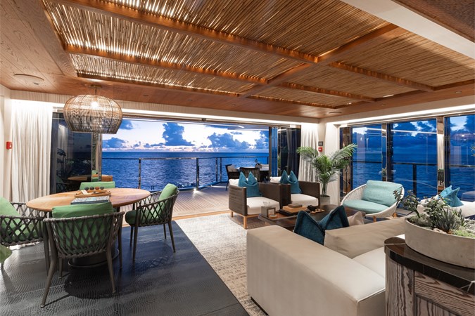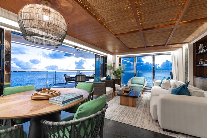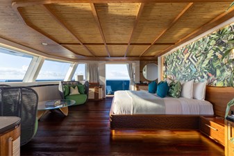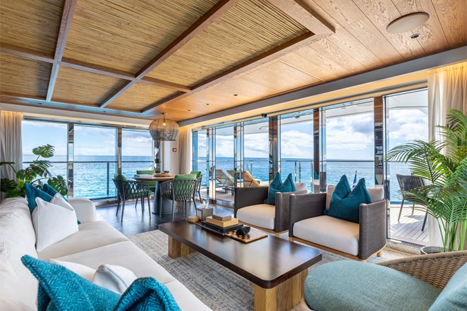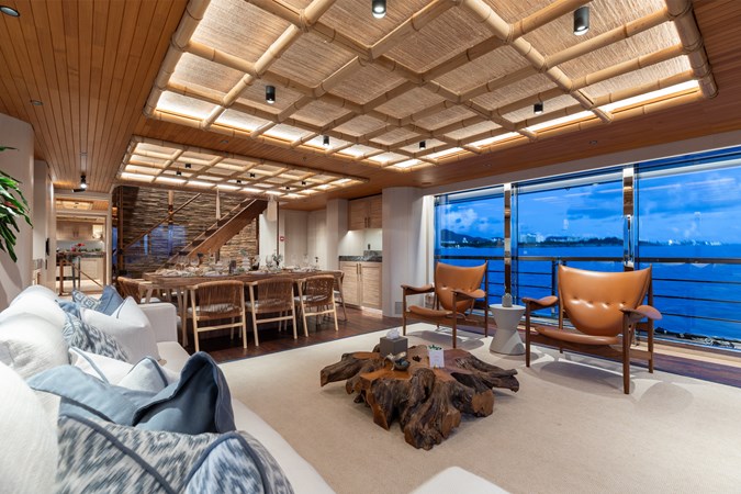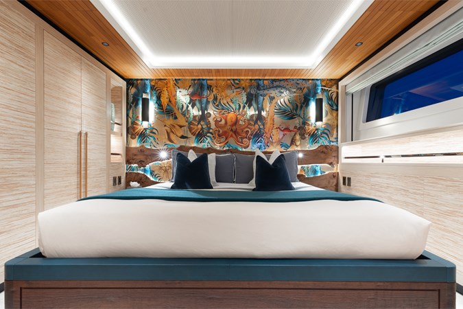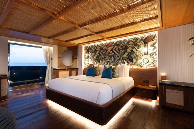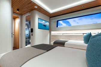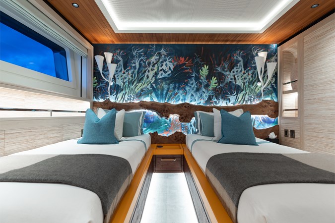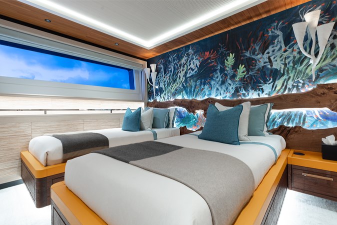 Interiors by Mark Tucker’s team at Design Unlimited blend wood, leather, and bamboo for a warm, inviting feel. Floor-to-ceiling, sill-less sliding doors flood the main saloon and sky lounge with natural light, creating seamless indoor-outdoor living. Guest areas feature distinctive marine-themed design and flexible bedding (twins or king).