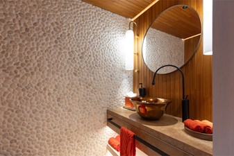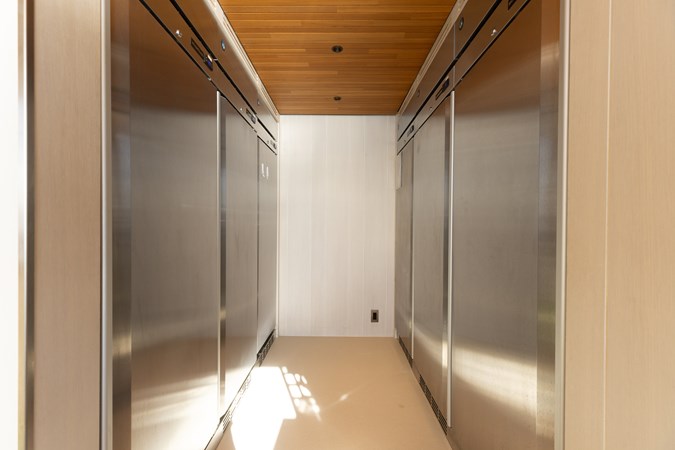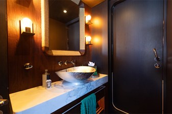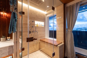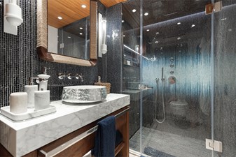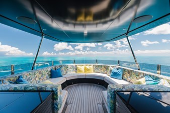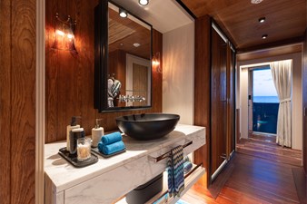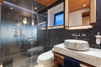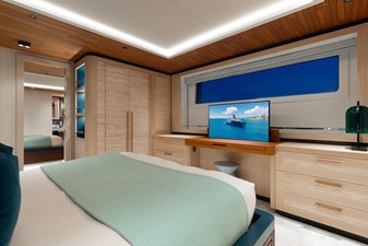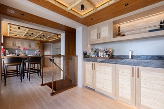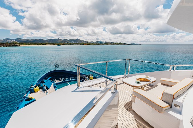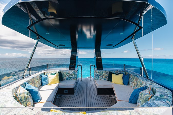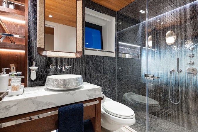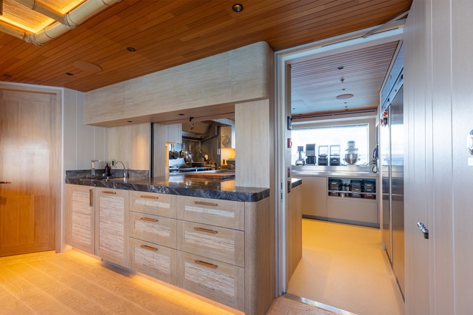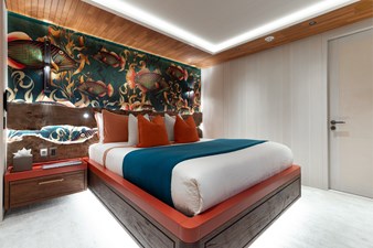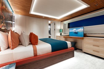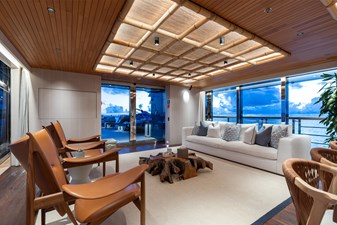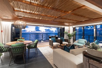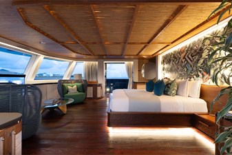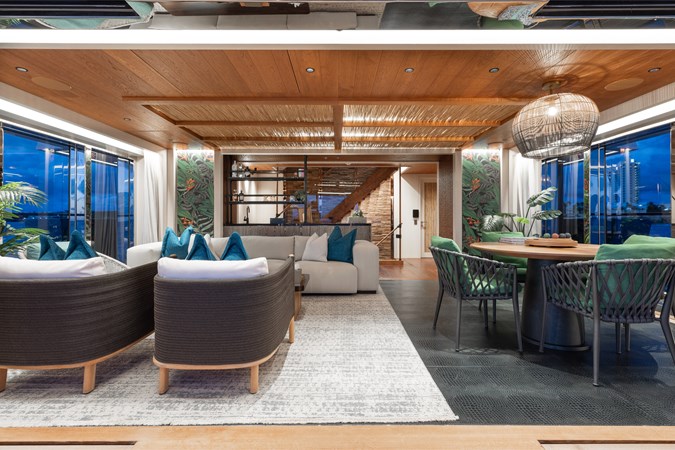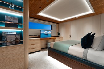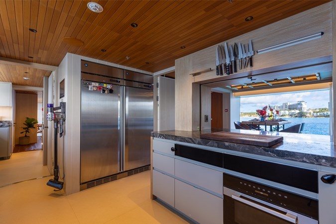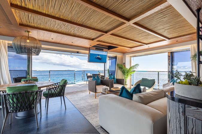 Interiors by Mark Tucker’s team at Design Unlimited blend wood, leather, and bamboo for a warm, inviting feel. Floor-to-ceiling, sill-less sliding doors flood the main saloon and sky lounge with natural light, creating seamless indoor-outdoor living. Guest areas feature distinctive marine-themed design and flexible bedding (twins or king).