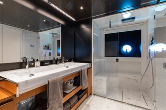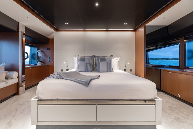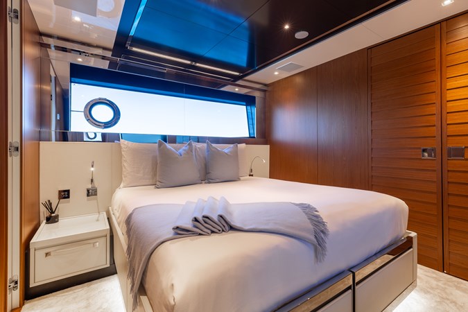 Rare for her size, KIYOMIZU features a full-beam master suite on the main deck, offering panoramic views, a private en-suite with walk-in shower, and a walk-in wardrobe. Below deck, the guest accommodations include: