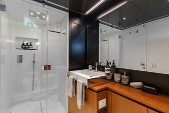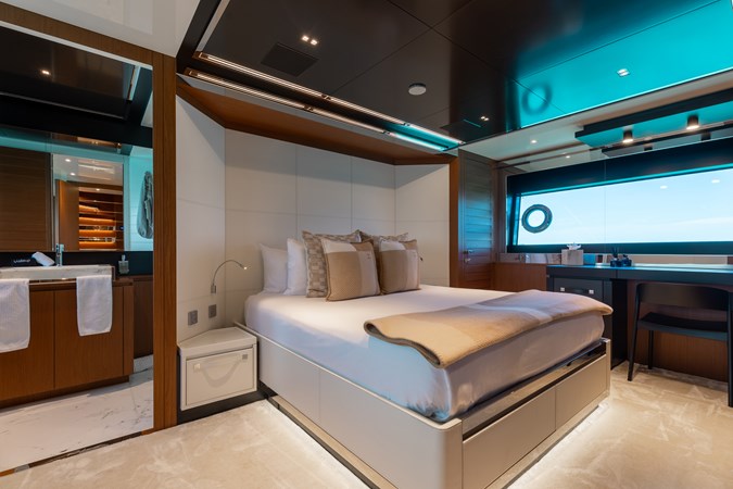 All guest cabins include en-suite bathrooms and share the same refined styling and generous headroom found throughout the yacht.