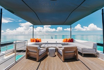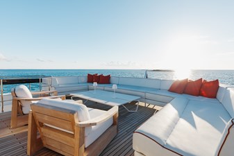 Step inside and you’re immediately immersed in natural light. The salon is surrounded by full-height glass windows that dissolve the boundary between interior and sea, creating an airy, open ambiance that evolves with every hour of the day. The layout is designed for both relaxation and entertaining—featuring a spacious lounge area aft, a formal dining space amidships, and seamless access to the aft deck through sliding glass doors.